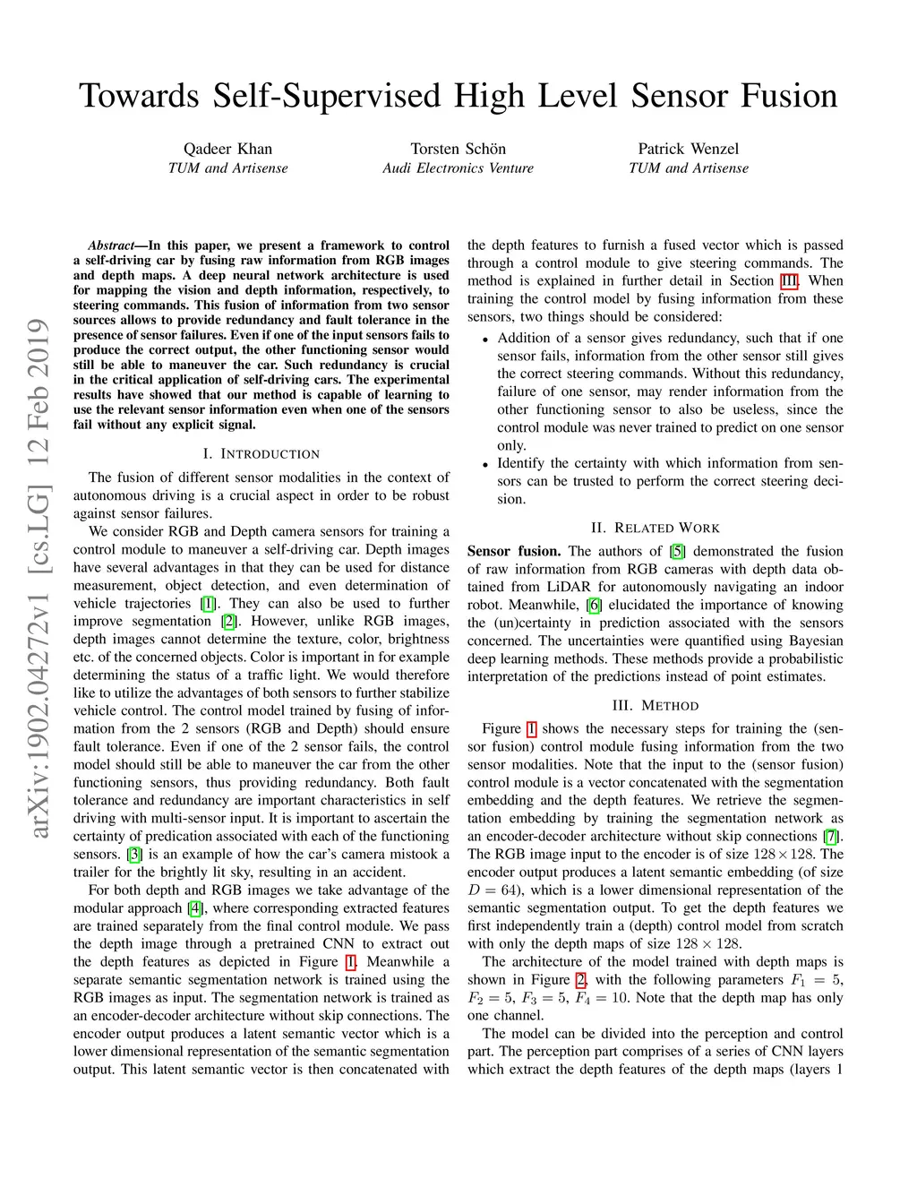 In this paper, we present a framework to control a self-driving car by fusing raw information from RGB images and depth maps. A deep neural network architecture is used for mapping the vision and depth information, respectively, to steering commands. This fusion of information from two sensor sources allows to provide redundancy and fault tolerance in the presence of sensor failures. Even if one of the input sensors fails to produce the correct output, the other functioning sensor would still be able to maneuver the car. Such redundancy is crucial in the critical application of self-driving cars. The experimental results have showed that our method is capable of learning to use the relevant sensor information even when one of the sensors fail without any explicit signal.