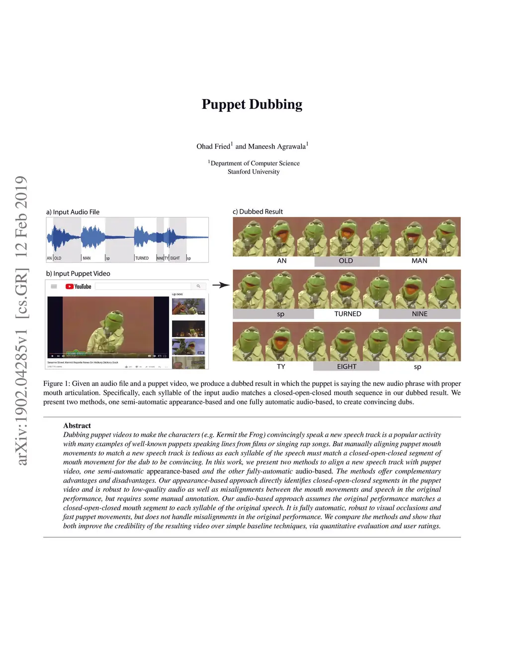 Dubbing puppet videos to make the characters (e.g. Kermit the Frog) convincingly speak a new speech track is a popular activity with many examples of well-known puppets speaking lines from films or singing rap songs. But manually aligning puppet mouth movements to match a new speech track is tedious as each syllable of the speech must match a closed-open-closed segment of mouth movement for the dub to be convincing. In this work, we present two methods to align a new speech track with puppet video, one semi-automatic appearance-based and the other fully-automatic audio-based. The methods offer complementary advantages and disadvantages. Our appearance-based approach directly identifies closed-open-closed segments in the puppet video and is robust to low-quality audio as well as misalignments between the mouth movements and speech in the original performance, but requires some manual annotation. Our audio-based approach assumes the original performance matches a closed-open-closed mouth segment to each syllable of the original speech. It is fully automatic, robust to visual occlusions and fast puppet movements, but does not handle misalignments in the original performance. We compare the methods and show that both improve the credibility of the resulting video over simple baseline techniques, via quantitative evaluation and user ratings.