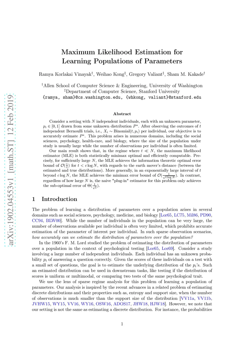 Consider a setting with independent individuals, each with an unknown parameter, drawn from some unknown distribution . After observing the outcomes of independent Bernoulli trials, i.e., per individual, our objective is to accurately estimate . This problem arises in numerous domains, including the social sciences, psychology, health-care, and biology, where the size of the population under study is usually large while the number of observations per individual is often limited. Our main result shows that, in the regime where , the maximum likelihood estimator (MLE) is both statistically minimax optimal and efficiently computable. Precisely, for sufficiently large , the MLE achieves the information theoretic optimal error bound of for , with regards to the earth mover's distance (between the estimated and true distributions). More generally, in an exponentially large interval of beyond , the MLE achieves the minimax error bound of . In contrast, regardless of how large is, the naive "plug-in" estimator for this problem only achieves the sub-optimal error of .