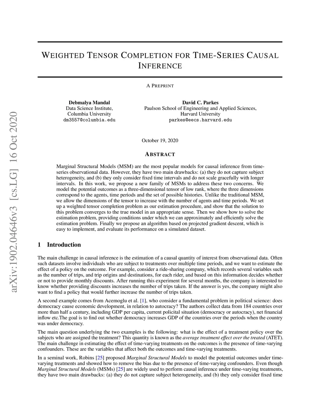Marginal Structural Models (MSM) are the most popular models for causal inference from time-series observational data. However, they have two main drawbacks: (a) they do not capture subject heterogeneity, and (b) they only consider fixed time intervals and do not scale gracefully with longer intervals. In this work, we propose a new family of MSMs to address these two concerns. We model the potential outcomes as a three-dimensional tensor of low rank, where the three dimensions correspond to the agents, time periods and the set of possible histories. Unlike the traditional MSM, we allow the dimensions of the tensor to increase with the number of agents and time periods. We set up a weighted tensor completion problem as our estimation procedure, and show that the solution to this problem converges to the true model in an appropriate sense. Then we show how to solve the estimation problem, providing conditions under which we can approximately and efficiently solve the estimation problem. Finally we propose an algorithm based on projected gradient descent, which is easy to implement, and evaluate its performance on a simulated dataset.