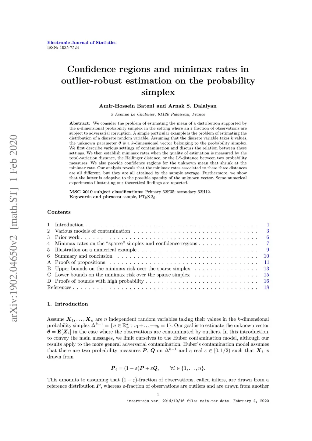 We consider the problem of estimating the mean of a distribution supported by the -dimensional probability simplex in the setting where an fraction of observations are subject to adversarial corruption. A simple particular example is the problem of estimating the distribution of a discrete random variable. Assuming that the discrete variable takes values, the unknown parameter is a -dimensional vector belonging to the probability simplex. We first describe various settings of contamination and discuss the relation between these settings. We then establish minimax rates when the quality of estimation is measured by the total-variation distance, the Hellinger distance, or the -distance between two probability measures. We also provide confidence regions for the unknown mean that shrink at the minimax rate. Our analysis reveals that the minimax rates associated to these three distances are all different, but they are all attained by the sample average. Furthermore, we show that the latter is adaptive to the possible sparsity of the unknown vector. Some numerical experiments illustrating our theoretical findings are reported.