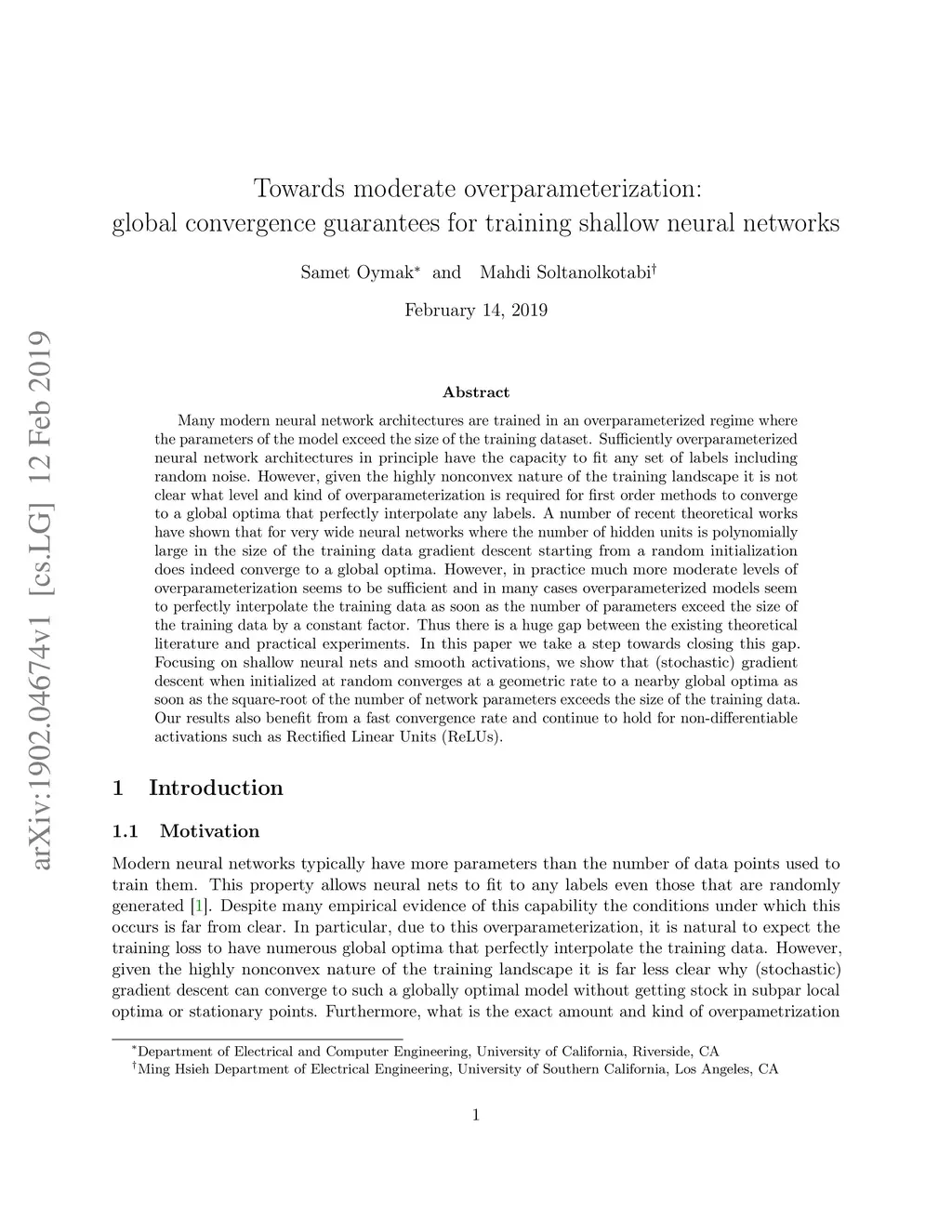 Many modern neural network architectures are trained in an overparameterized regime where the parameters of the model exceed the size of the training dataset. Sufficiently overparameterized neural network architectures in principle have the capacity to fit any set of labels including random noise. However, given the highly nonconvex nature of the training landscape it is not clear what level and kind of overparameterization is required for first order methods to converge to a global optima that perfectly interpolate any labels. A number of recent theoretical works have shown that for very wide neural networks where the number of hidden units is polynomially large in the size of the training data gradient descent starting from a random initialization does indeed converge to a global optima. However, in practice much more moderate levels of overparameterization seems to be sufficient and in many cases overparameterized models seem to perfectly interpolate the training data as soon as the number of parameters exceed the size of the training data by a constant factor. Thus there is a huge gap between the existing theoretical literature and practical experiments. In this paper we take a step towards closing this gap. Focusing on shallow neural nets and smooth activations, we show that (stochastic) gradient descent when initialized at random converges at a geometric rate to a nearby global optima as soon as the square-root of the number of network parameters exceeds the size of the training data. Our results also benefit from a fast convergence rate and continue to hold for non-differentiable activations such as Rectified Linear Units (ReLUs).