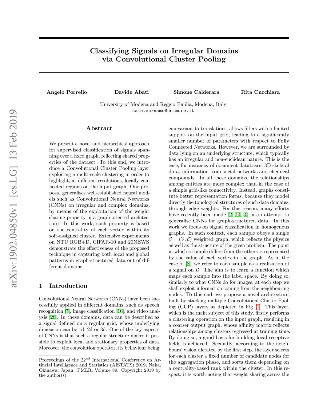 We present a novel and hierarchical approach for supervised classification of signals spanning over a fixed graph, reflecting shared properties of the dataset. To this end, we introduce a Convolutional Cluster Pooling layer exploiting a multi-scale clustering in order to highlight, at different resolutions, locally connected regions on the input graph. Our proposal generalises well-established neural models such as Convolutional Neural Networks (CNNs) on irregular and complex domains, by means of the exploitation of the weight sharing property in a graph-oriented architecture. In this work, such property is based on the centrality of each vertex within its soft-assigned cluster. Extensive experiments on NTU RGB+D, CIFAR-10 and 20NEWS demonstrate the effectiveness of the proposed technique in capturing both local and global patterns in graph-structured data out of different domains.