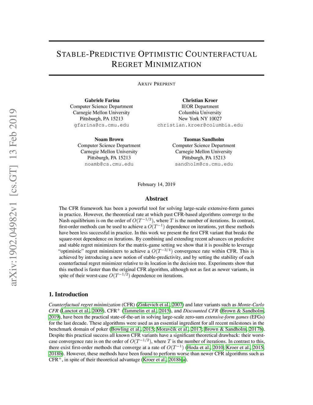 The CFR framework has been a powerful tool for solving large-scale extensive-form games in practice. However, the theoretical rate at which past CFR-based algorithms converge to the Nash equilibrium is on the order of , where is the number of iterations. In contrast, first-order methods can be used to achieve a dependence on iterations, yet these methods have been less successful in practice. In this work we present the first CFR variant that breaks the square-root dependence on iterations. By combining and extending recent advances on predictive and stable regret minimizers for the matrix-game setting we show that it is possible to leverage "optimistic" regret minimizers to achieve a convergence rate within CFR. This is achieved by introducing a new notion of stable-predictivity, and by setting the stability of each counterfactual regret minimizer relative to its location in the decision tree. Experiments show that this method is faster than the original CFR algorithm, although not as fast as newer variants, in spite of their worst-case dependence on iterations.