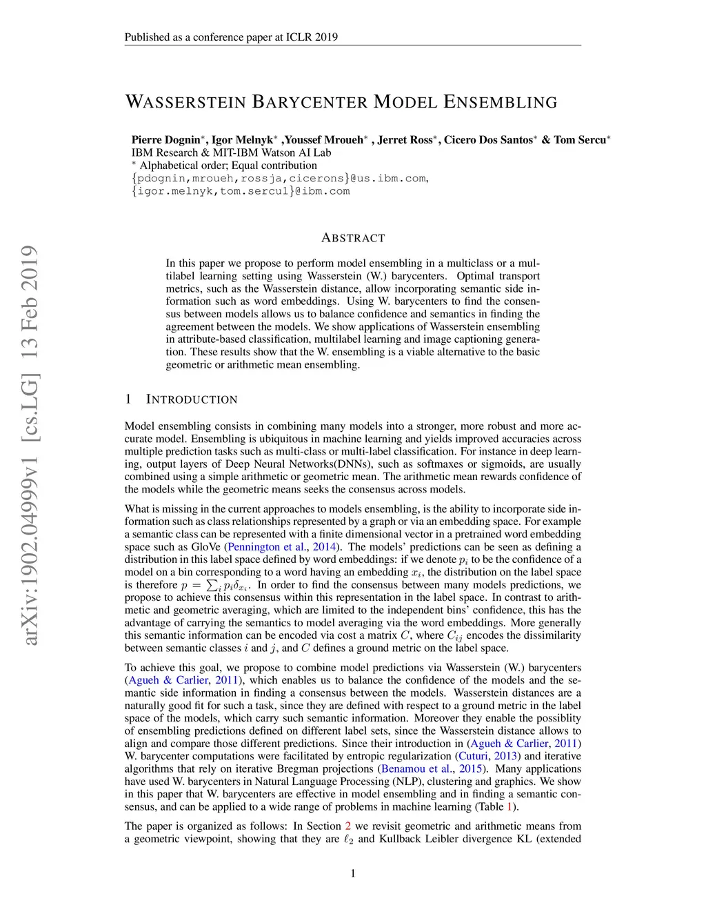 In this paper we propose to perform model ensembling in a multiclass or a multilabel learning setting using Wasserstein (W.) barycenters. Optimal transport metrics, such as the Wasserstein distance, allow incorporating semantic side information such as word embeddings. Using W. barycenters to find the consensus between models allows us to balance confidence and semantics in finding the agreement between the models. We show applications of Wasserstein ensembling in attribute-based classification, multilabel learning and image captioning generation. These results show that the W. ensembling is a viable alternative to the basic geometric or arithmetic mean ensembling.