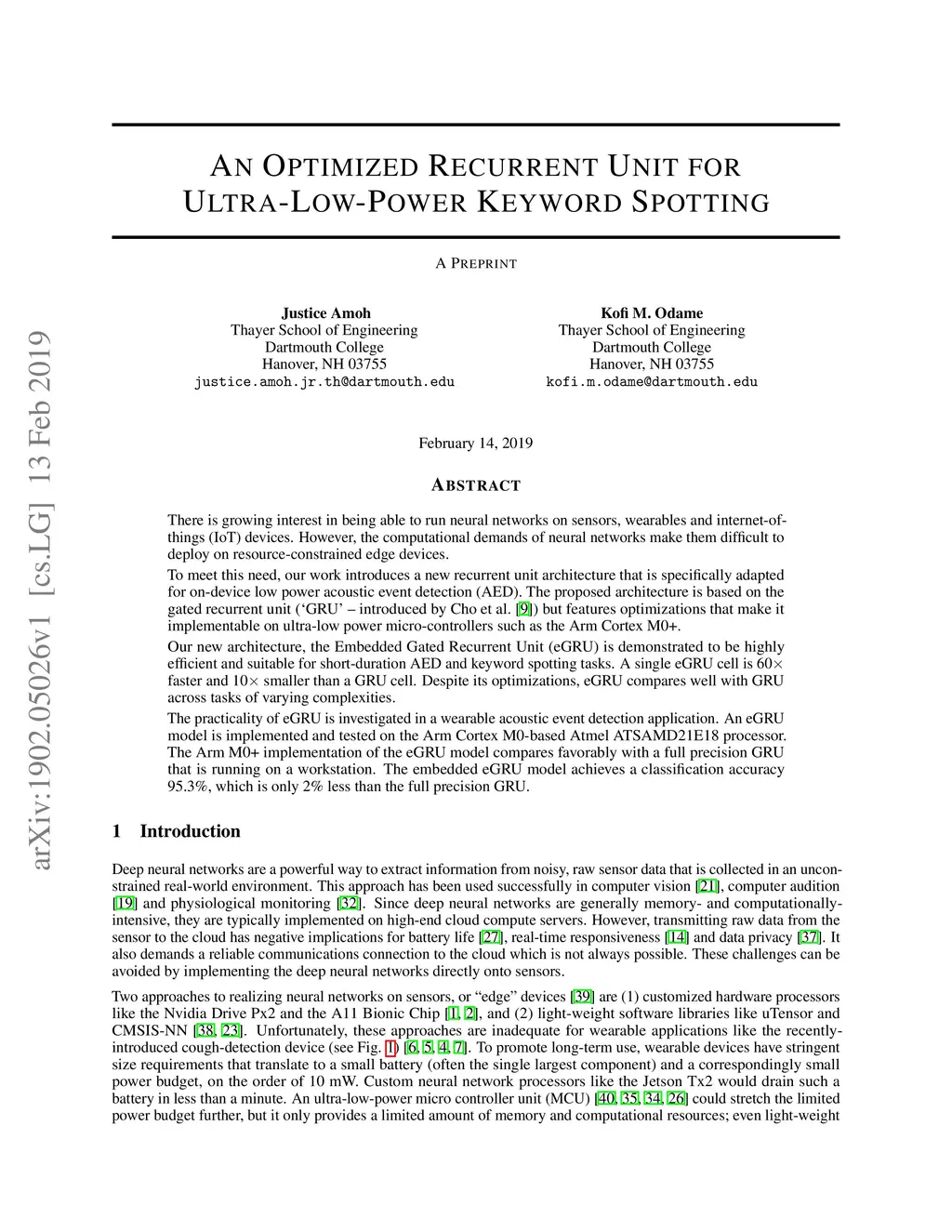 There is growing interest in being able to run neural networks on sensors, wearables and internet-of-things (IoT) devices. However, the computational demands of neural networks make them difficult to deploy on resource-constrained edge devices. To meet this need, our work introduces a new recurrent unit architecture that is specifically adapted for on-device low power acoustic event detection (AED). The proposed architecture is based on the gated recurrent unit (`GRU') but features optimizations that make it implementable on ultra-low power micro-controllers such as the Arm Cortex M0+. Our new architecture, the Embedded Gated Recurrent Unit (eGRU) is demonstrated to be highly efficient and suitable for short-duration AED and keyword spotting tasks. A single eGRU cell is 60x faster and 10x smaller than a GRU cell. Despite its optimizations, eGRU compares well with GRU across tasks of varying complexities. The practicality of eGRU is investigated in a wearable acoustic event detection application. An eGRU model is implemented and tested on the Arm Cortex M0-based Atmel ATSAMD21E18 processor. The Arm M0+ implementation of the eGRU model compares favorably with a full precision GRU that is running on a workstation. The embedded eGRU model achieves a classification accuracy 95.3%, which is only 2% less than the full precision GRU.