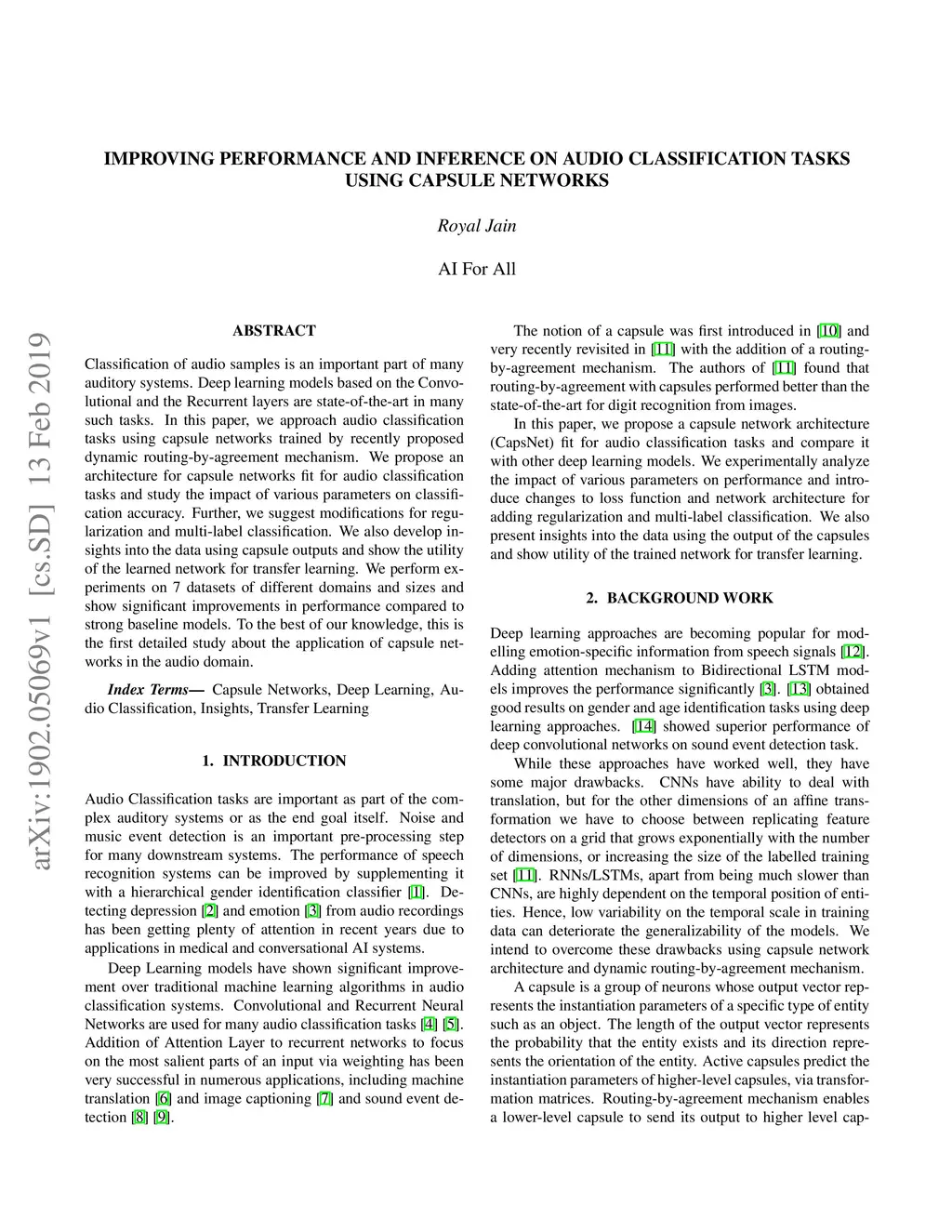 Classification of audio samples is an important part of many auditory systems. Deep learning models based on the Convolutional and the Recurrent layers are state-of-the-art in many such tasks. In this paper, we approach audio classification tasks using capsule networks trained by recently proposed dynamic routing-by-agreement mechanism. We propose an architecture for capsule networks fit for audio classification tasks and study the impact of various parameters on classification accuracy. Further, we suggest modifications for regularization and multi-label classification. We also develop insights into the data using capsule outputs and show the utility of the learned network for transfer learning. We perform experiments on 7 datasets of different domains and sizes and show significant improvements in performance compared to strong baseline models. To the best of our knowledge, this is the first detailed study about the application of capsule networks in the audio domain.
