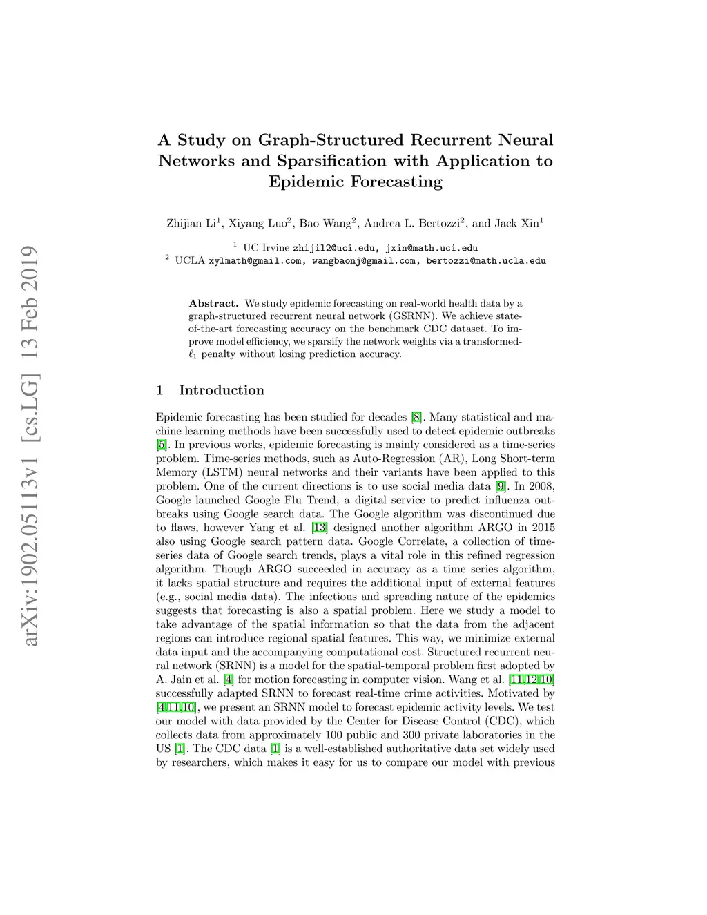 We study epidemic forecasting on real-world health data by a graph-structured recurrent neural network (GSRNN). We achieve state-of-the-art forecasting accuracy on the benchmark CDC dataset. To improve model efficiency, we sparsify the network weights via transformed- penalty and maintain prediction accuracy at the same level with 70% of the network weights being zero.