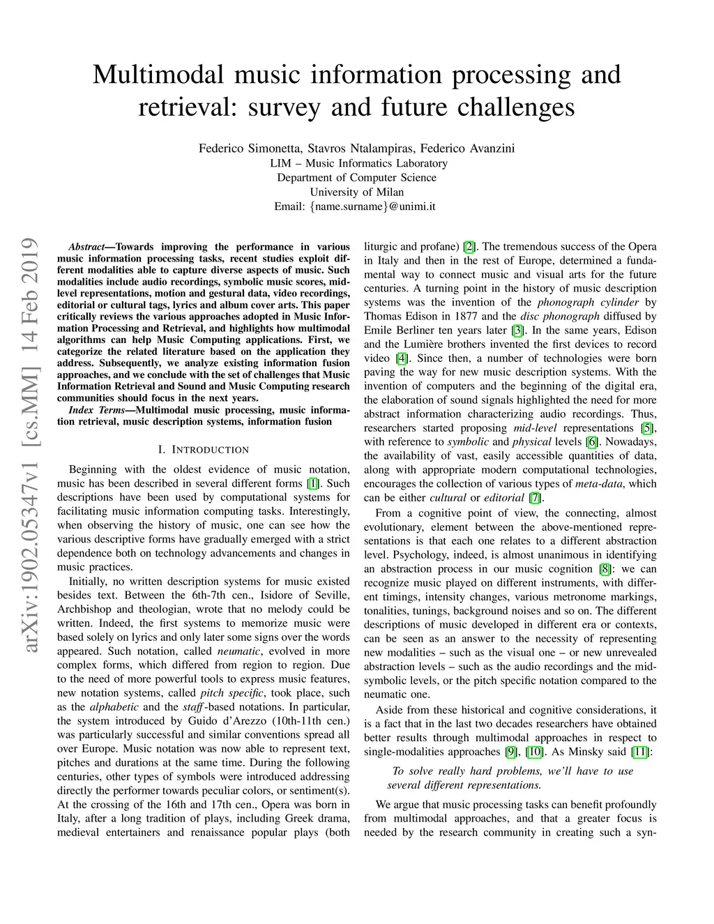 Towards improving the performance in various music information processing tasks, recent studies exploit different modalities able to capture diverse aspects of music. Such modalities include audio recordings, symbolic music scores, mid-level representations, motion, and gestural data, video recordings, editorial or cultural tags, lyrics and album cover arts. This paper critically reviews the various approaches adopted in Music Information Processing and Retrieval and highlights how multimodal algorithms can help Music Computing applications. First, we categorize the related literature based on the application they address. Subsequently, we analyze existing information fusion approaches, and we conclude with the set of challenges that Music Information Retrieval and Sound and Music Computing research communities should focus in the next years.