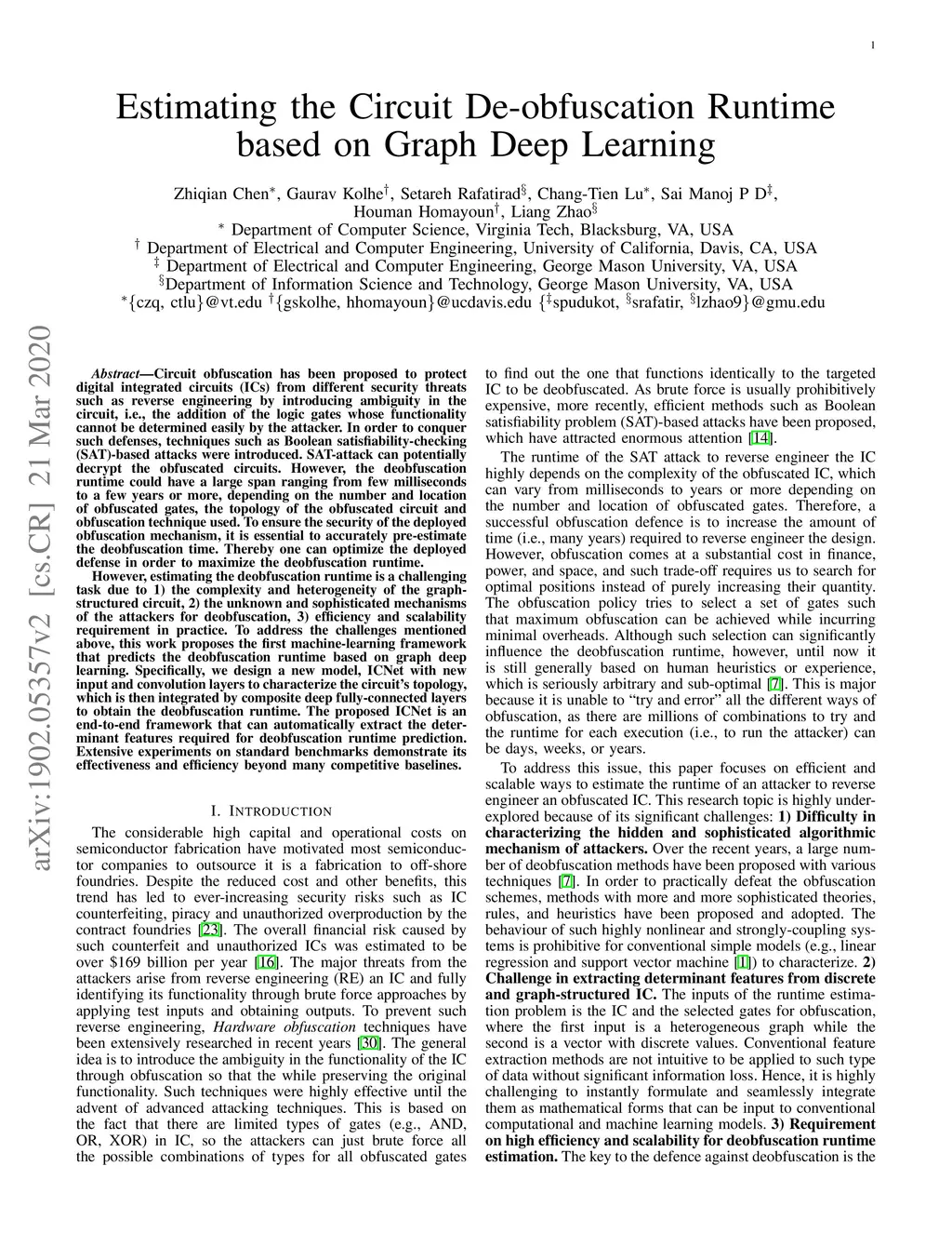Circuit obfuscation is a recently proposed defense mechanism to protect digital integrated circuits (ICs) from reverse engineering by using camouflaged gates i.e., logic gates whose functionality cannot be precisely determined by the attacker. There have been effective schemes such as satisfiability-checking (SAT)-based attacks that can potentially decrypt obfuscated circuits, called deobfuscation. Deobfuscation runtime could have a large span ranging from few milliseconds to thousands of years or more, depending on the number and layouts of the ICs and camouflaged gates. And hence accurately pre-estimating the deobfuscation runtime is highly crucial for the defenders to maximize it and optimize their defense. However, estimating the deobfuscation runtime is a challenging task due to 1) the complexity and heterogeneity of graph-structured circuit, 2) the unknown and sophisticated mechanisms of the attackers for deobfuscation. To address the above mentioned challenges, this work proposes the first machine-learning framework that predicts the deobfuscation runtime based on graph deep learning techniques. Specifically, we design a new model, ICNet with new input and convolution layers to characterize and extract graph frequencies from ICs, which are then integrated by heterogeneous deep fully-connected layers to obtain final output. ICNet is an end-to-end framework which can automatically extract the determinant features for deobfuscation runtime. Extensive experiments demonstrate its effectiveness and efficiency.