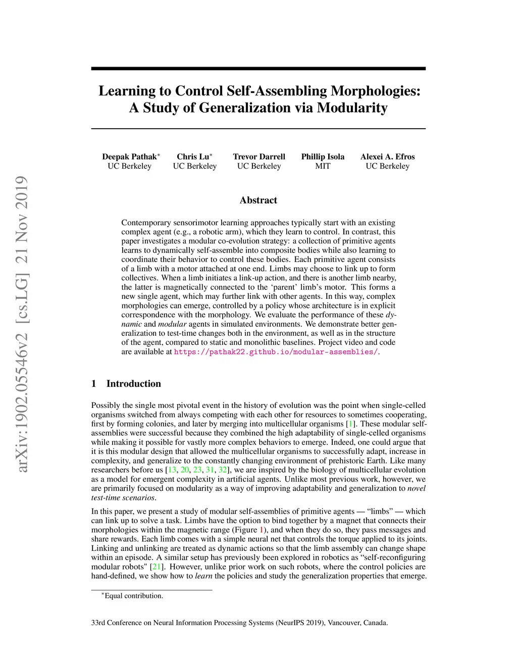 Contemporary sensorimotor learning approaches typically start with an existing complex agent (e.g., a robotic arm), which they learn to control. In contrast, this paper investigates a modular co-evolution strategy: a collection of primitive agents learns to dynamically self-assemble into composite bodies while also learning to coordinate their behavior to control these bodies. Each primitive agent consists of a limb with a motor attached at one end. Limbs may choose to link up to form collectives. When a limb initiates a link-up action, and there is another limb nearby, the latter is magnetically connected to the 'parent' limb's motor. This forms a new single agent, which may further link with other agents. In this way, complex morphologies can emerge, controlled by a policy whose architecture is in explicit correspondence with the morphology. We evaluate the performance of these dynamic and modular agents in simulated environments. We demonstrate better generalization to test-time changes both in the environment, as well as in the structure of the agent, compared to static and monolithic baselines. Project video and code are available at https://pathak22.github.io/modular-assemblies/