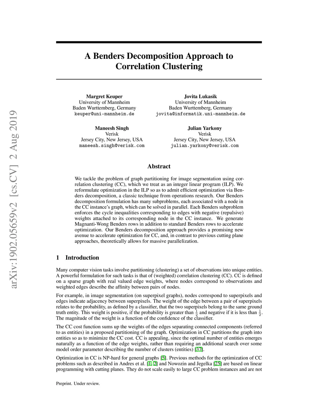 We tackle the problem of graph partitioning for image segmentation using correlation clustering (CC), which we treat as an integer linear program (ILP). We reformulate optimization in the ILP so as to admit efficient optimization via Benders decomposition, a classic technique from operations research. Our Benders decomposition formulation has many subproblems, each associated with a node in the CC instance's graph, which are solved in parallel. Each Benders subproblem enforces the cycle inequalities corresponding to the negative weight edges attached to its corresponding node in the CC instance. We generate Magnanti-Wong Benders rows in addition to standard Benders rows, to accelerate optimization. Our Benders decomposition approach provides a promising new avenue to accelerate optimization for CC, and allows for massive parallelization.