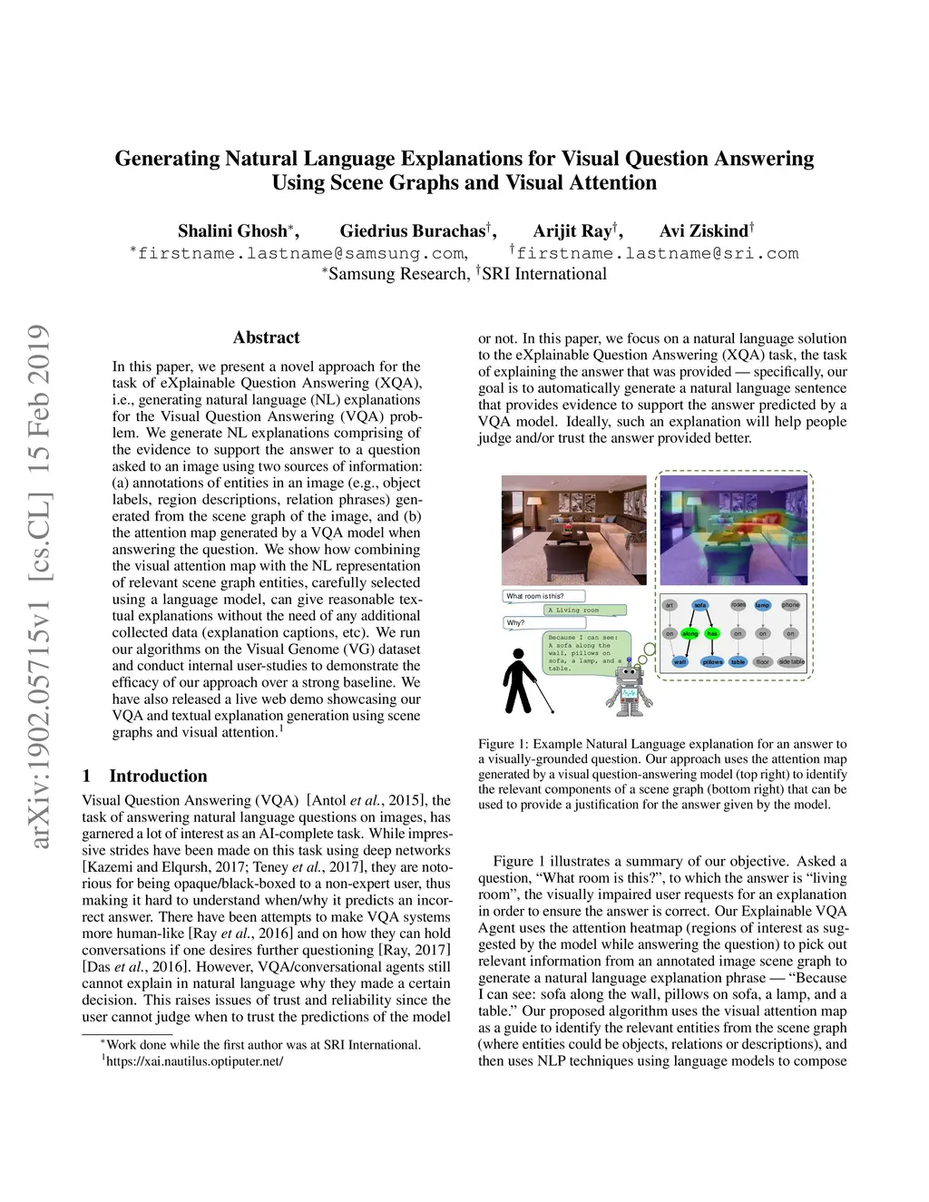 In this paper, we present a novel approach for the task of eXplainable Question Answering (XQA), i.e., generating natural language (NL) explanations for the Visual Question Answering (VQA) problem. We generate NL explanations comprising of the evidence to support the answer to a question asked to an image using two sources of information: (a) annotations of entities in an image (e.g., object labels, region descriptions, relation phrases) generated from the scene graph of the image, and (b) the attention map generated by a VQA model when answering the question. We show how combining the visual attention map with the NL representation of relevant scene graph entities, carefully selected using a language model, can give reasonable textual explanations without the need of any additional collected data (explanation captions, etc). We run our algorithms on the Visual Genome (VG) dataset and conduct internal user-studies to demonstrate the efficacy of our approach over a strong baseline. We have also released a live web demo showcasing our VQA and textual explanation generation using scene graphs and visual attention.