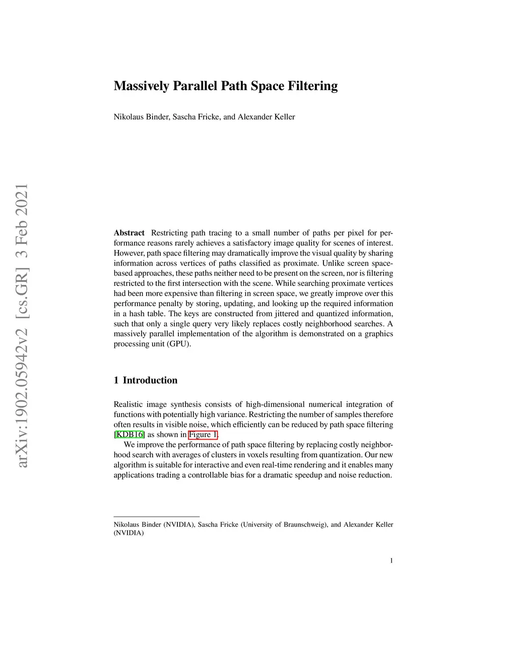 Restricting path tracing to a small number of paths per pixel for performance reasons rarely achieves a satisfactory image quality for scenes of interest. However, path space filtering may dramatically improve the visual quality by sharing information across vertices of paths classified as proximate. Unlike screen space-based approaches, these paths neither need to be present on the screen, nor is filtering restricted to the first intersection with the scene. While searching proximate vertices had been more expensive than filtering in screen space, we greatly improve over this performance penalty by storing, updating, and looking up the required information in a hash table. The keys are constructed from jittered and quantized information, such that only a single query very likely replaces costly neighborhood searches. A massively parallel implementation of the algorithm is demonstrated on a graphics processing unit (GPU).