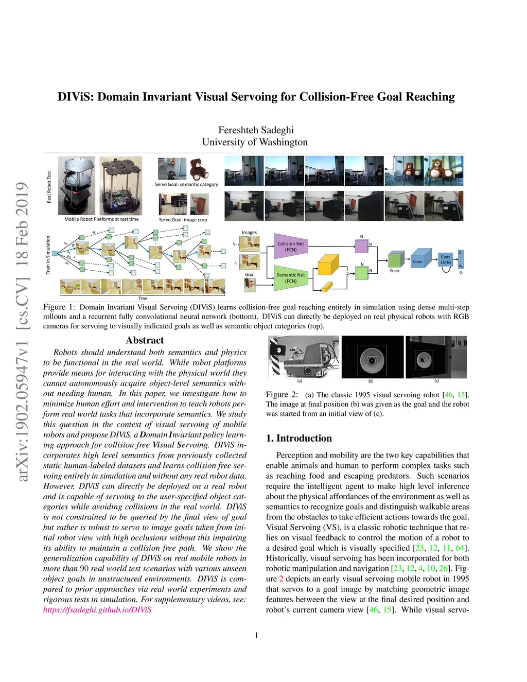 Robots should understand both semantics and physics to be functional in the real world. While robot platforms provide means for interacting with the physical world they cannot autonomously acquire object-level semantics without needing human. In this paper, we investigate how to minimize human effort and intervention to teach robots perform real world tasks that incorporate semantics. We study this question in the context of visual servoing of mobile robots and propose DIViS, a Domain Invariant policy learning approach for collision free Visual Servoing. DIViS incorporates high level semantics from previously collected static human-labeled datasets and learns collision free servoing entirely in simulation and without any real robot data. However, DIViS can directly be deployed on a real robot and is capable of servoing to the user-specified object categories while avoiding collisions in the real world. DIViS is not constrained to be queried by the final view of goal but rather is robust to servo to image goals taken from initial robot view with high occlusions without this impairing its ability to maintain a collision free path. We show the generalization capability of DIViS on real mobile robots in more than 90 real world test scenarios with various unseen object goals in unstructured environments. DIViS is compared to prior approaches via real world experiments and rigorous tests in simulation. For supplementary videos, see: \href{https://fsadeghi.github.io/DIViS}{https://fsadeghi.github.io/DIViS}