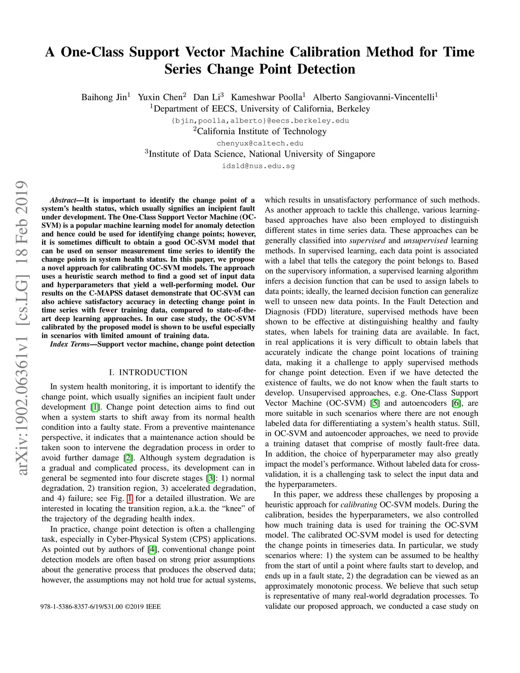 It is important to identify the change point of a system's health status, which usually signifies an incipient fault under development. The One-Class Support Vector Machine (OC-SVM) is a popular machine learning model for anomaly detection and hence could be used for identifying change points; however, it is sometimes difficult to obtain a good OC-SVM model that can be used on sensor measurement time series to identify the change points in system health status. In this paper, we propose a novel approach for calibrating OC-SVM models. The approach uses a heuristic search method to find a good set of input data and hyperparameters that yield a well-performing model. Our results on the C-MAPSS dataset demonstrate that OC-SVM can also achieve satisfactory accuracy in detecting change point in time series with fewer training data, compared to state-of-the-art deep learning approaches. In our case study, the OC-SVM calibrated by the proposed model is shown to be useful especially in scenarios with limited amount of training data.