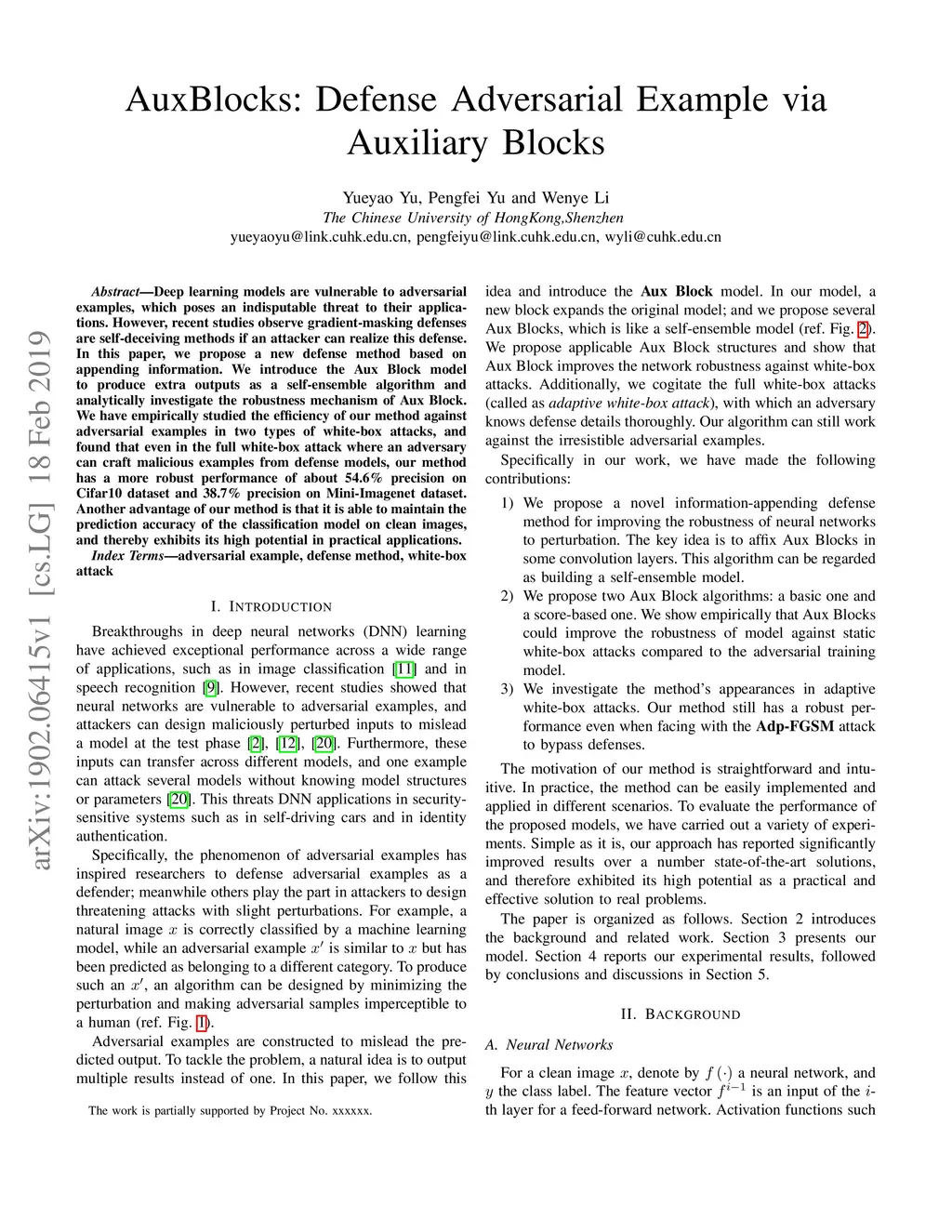 AuxBlocks: Defense Adversarial Example via Auxiliary Blocks