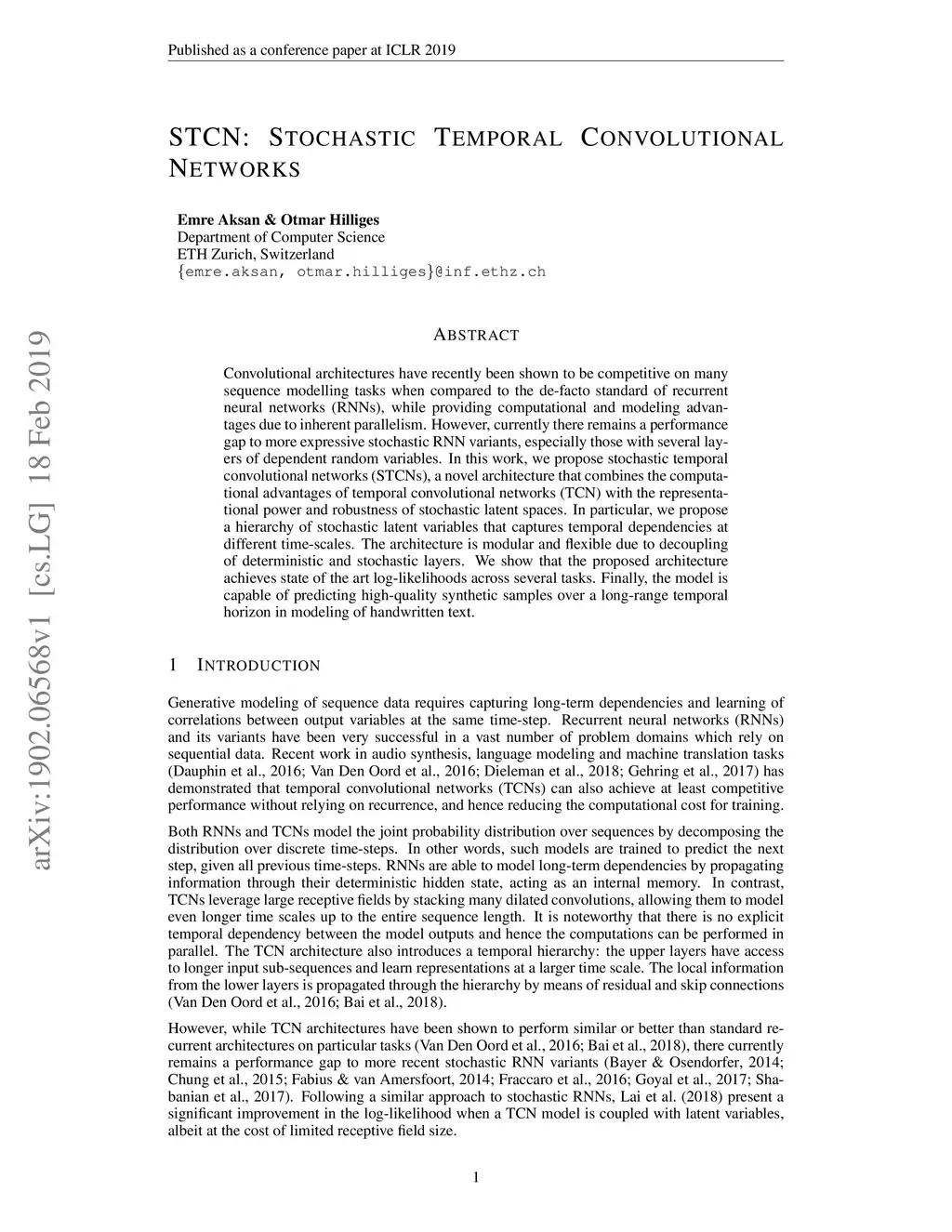 Convolutional architectures have recently been shown to be competitive on many sequence modelling tasks when compared to the de-facto standard of recurrent neural networks (RNNs), while providing computational and modeling advantages due to inherent parallelism. However, currently there remains a performance gap to more expressive stochastic RNN variants, especially those with several layers of dependent random variables. In this work, we propose stochastic temporal convolutional networks (STCNs), a novel architecture that combines the computational advantages of temporal convolutional networks (TCN) with the representational power and robustness of stochastic latent spaces. In particular, we propose a hierarchy of stochastic latent variables that captures temporal dependencies at different time-scales. The architecture is modular and flexible due to the decoupling of the deterministic and stochastic layers. We show that the proposed architecture achieves state of the art log-likelihoods across several tasks. Finally, the model is capable of predicting high-quality synthetic samples over a long-range temporal horizon in modeling of handwritten text.