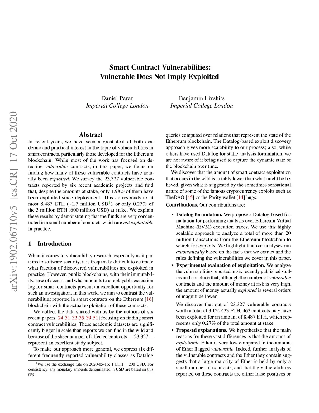 Smart Contract Vulnerabilities: Vulnerable Does Not Imply Exploited