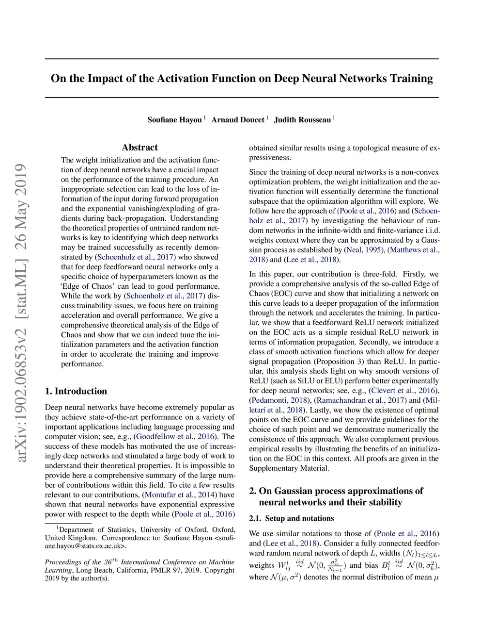 The weight initialization and the activation function of deep neural networks have a crucial impact on the performance of the training procedure. An inappropriate selection can lead to the loss of information of the input during forward propagation and the exponential vanishing/exploding of gradients during back-propagation. Understanding the theoretical properties of untrained random networks is key to identifying which deep networks may be trained successfully as recently demonstrated by Samuel et al (2017) who showed that for deep feedforward neural networks only a specific choice of hyperparameters known as the `Edge of Chaos' can lead to good performance. While the work by Samuel et al (2017) discuss trainability issues, we focus here on training acceleration and overall performance. We give a comprehensive theoretical analysis of the Edge of Chaos and show that we can indeed tune the initialization parameters and the activation function in order to accelerate the training and improve the performance.