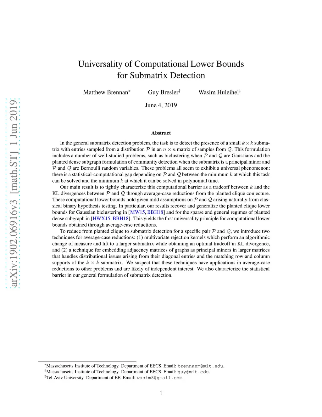 In the general submatrix detection problem, the task is to detect the presence of a small submatrix with entries sampled from a distribution in an matrix of samples from . This formulation includes a number of well-studied problems, such as biclustering when and are Gaussians and the planted dense subgraph formulation of community detection when the submatrix is a principal minor and and are Bernoulli random variables. These problems all seem to exhibit a universal phenomenon: there is a statistical-computational gap depending on and between the minimum at which this task can be solved and the minimum at which it can be solved in polynomial time. Our main result is to tightly characterize this computational barrier as a tradeoff between and the KL divergences between and through average-case reductions from the planted clique conjecture. These computational lower bounds hold given mild assumptions on and arising naturally from classical binary hypothesis testing. Our results recover and generalize the planted clique lower bounds for Gaussian biclustering in Ma-Wu (2015) and Brennan et al. (2018) and for the sparse and general regimes of planted dense subgraph in Hajek et al. (2015) and Brennan et al. (2018). This yields the first universality principle for computational lower bounds obtained through average-case reductions.