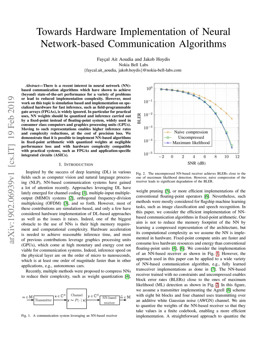 There is a recent interest in neural network (NN)-based communication algorithms which have shown to achieve (beyond) state-of-the-art performance for a variety of problems or lead to reduced implementation complexity. However, most work on this topic is simulation based and implementation on specialized hardware for fast inference, such as field-programmable gate arrays (FPGAs), is widely ignored. In particular for practical uses, NN weights should be quantized and inference carried out by a fixed-point instead of floating-point system, widely used in consumer class computers and graphics processing units (GPUs). Moving to such representations enables higher inference rates and complexity reductions, at the cost of precision loss. We demonstrate that it is possible to implement NN-based algorithms in fixed-point arithmetic with quantized weights at negligible performance loss and with hardware complexity compatible with practical systems, such as FPGAs and application-specific integrated circuits (ASICs).