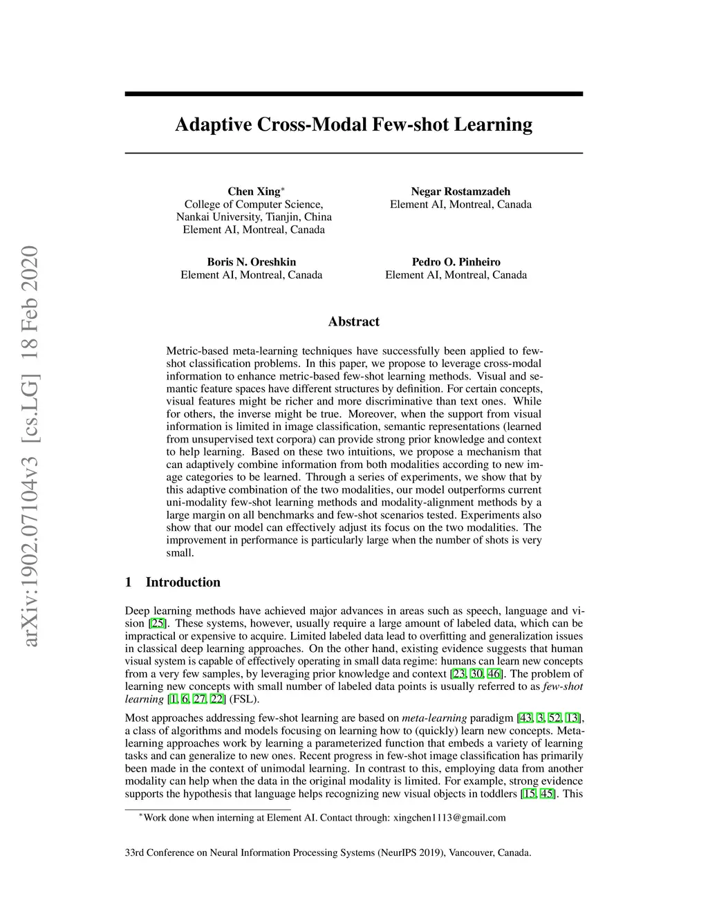 Metric-based meta-learning techniques have successfully been applied to few-shot classification problems. In this paper, we propose to leverage cross-modal information to enhance metric-based few-shot learning methods. Visual and semantic feature spaces have different structures by definition. For certain concepts, visual features might be richer and more discriminative than text ones. While for others, the inverse might be true. Moreover, when the support from visual information is limited in image classification, semantic representations (learned from unsupervised text corpora) can provide strong prior knowledge and context to help learning. Based on these two intuitions, we propose a mechanism that can adaptively combine information from both modalities according to new image categories to be learned. Through a series of experiments, we show that by this adaptive combination of the two modalities, our model outperforms current uni-modality few-shot learning methods and modality-alignment methods by a large margin on all benchmarks and few-shot scenarios tested. Experiments also show that our model can effectively adjust its focus on the two modalities. The improvement in performance is particularly large when the number of shots is very small.
