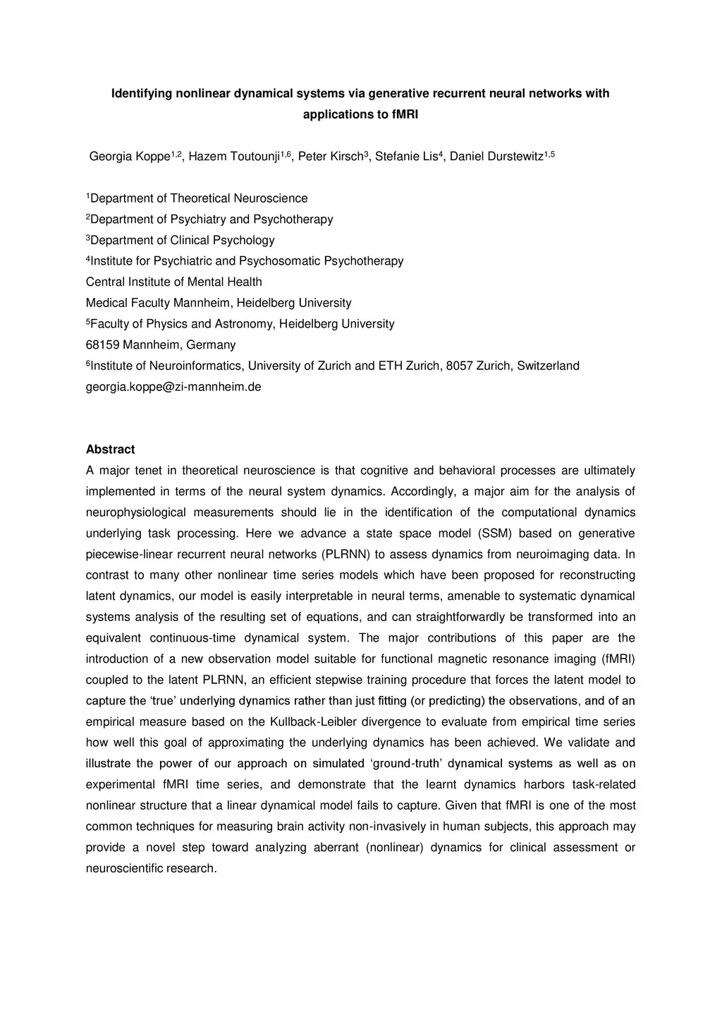 A major tenet in theoretical neuroscience is that cognitive and behavioral processes are ultimately implemented in terms of the neural system dynamics. Accordingly, a major aim for the analysis of neurophysiological measurements should lie in the identification of the computational dynamics underlying task processing. Here we advance a state space model (SSM) based on generative piecewise-linear recurrent neural networks (PLRNN) to assess dynamics from neuroimaging data. In contrast to many other nonlinear time series models which have been proposed for reconstructing latent dynamics, our model is easily interpretable in neural terms, amenable to systematic dynamical systems analysis of the resulting set of equations, and can straightforwardly be transformed into an equivalent continuous-time dynamical system. The major contributions of this paper are the introduction of a new observation model suitable for functional magnetic resonance imaging (fMRI) coupled to the latent PLRNN, an efficient stepwise training procedure that forces the latent model to capture the 'true' underlying dynamics rather than just fitting (or predicting) the observations, and of an empirical measure based on the Kullback-Leibler divergence to evaluate from empirical time series how well this goal of approximating the underlying dynamics has been achieved. We validate and illustrate the power of our approach on simulated 'ground-truth' dynamical (benchmark) systems as well as on actual experimental fMRI time series, and demonstrate that the latent dynamics harbors task-related nonlinear structure that a linear dynamical model fails to capture. Given that fMRI is one of the most common techniques for measuring brain activity non-invasively in human subjects, this approach may provide a novel step toward analyzing aberrant (nonlinear) dynamics for clinical assessment or neuroscientific research.
