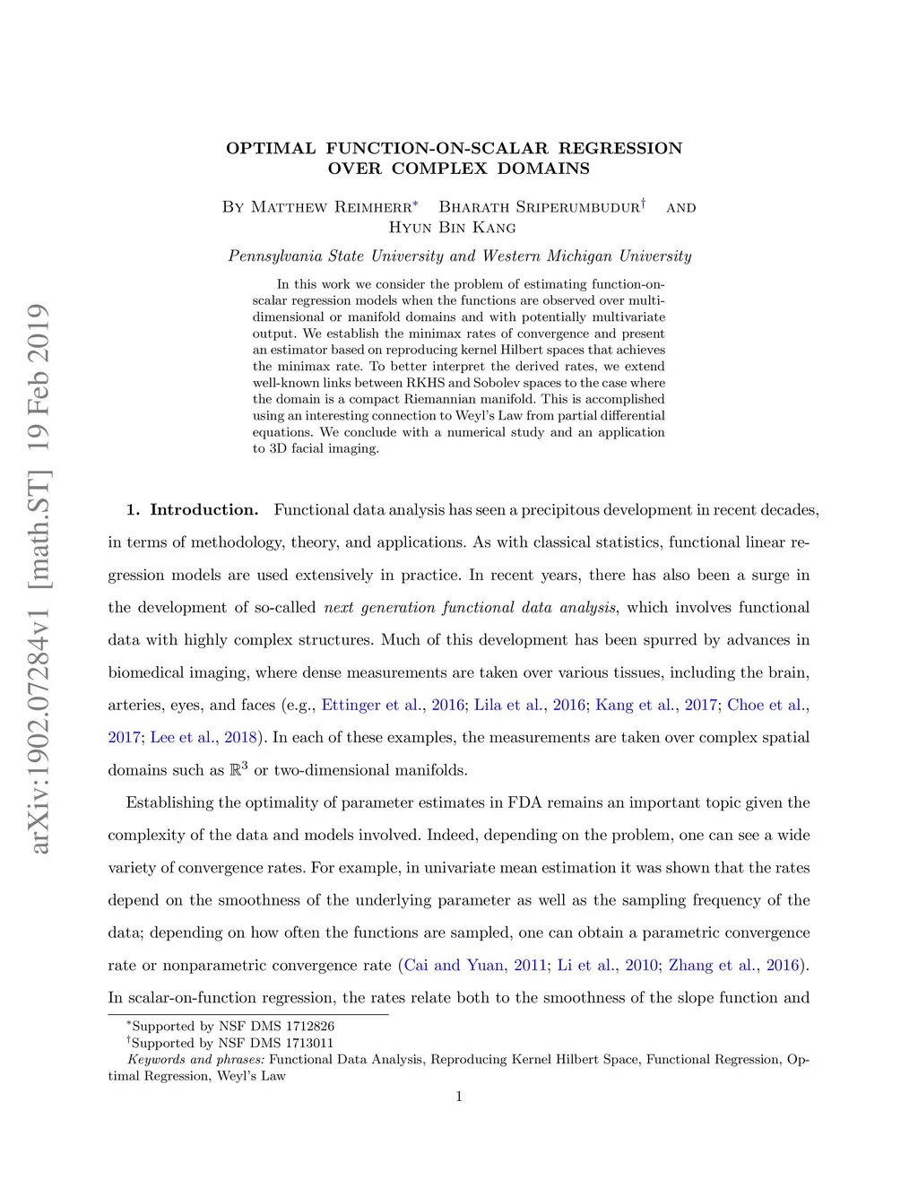 In this work we consider the problem of estimating function-on-scalar regression models when the functions are observed over multi-dimensional or manifold domains and with potentially multivariate output. We establish the minimax rates of convergence and present an estimator based on reproducing kernel Hilbert spaces that achieves the minimax rate. To better interpret the derived rates, we extend well-known links between RKHS and Sobolev spaces to the case where the domain is a compact Riemannian manifold. This is accomplished using an interesting connection to Weyl's Law from partial differential equations. We conclude with a numerical study and an application to 3D facial imaging.