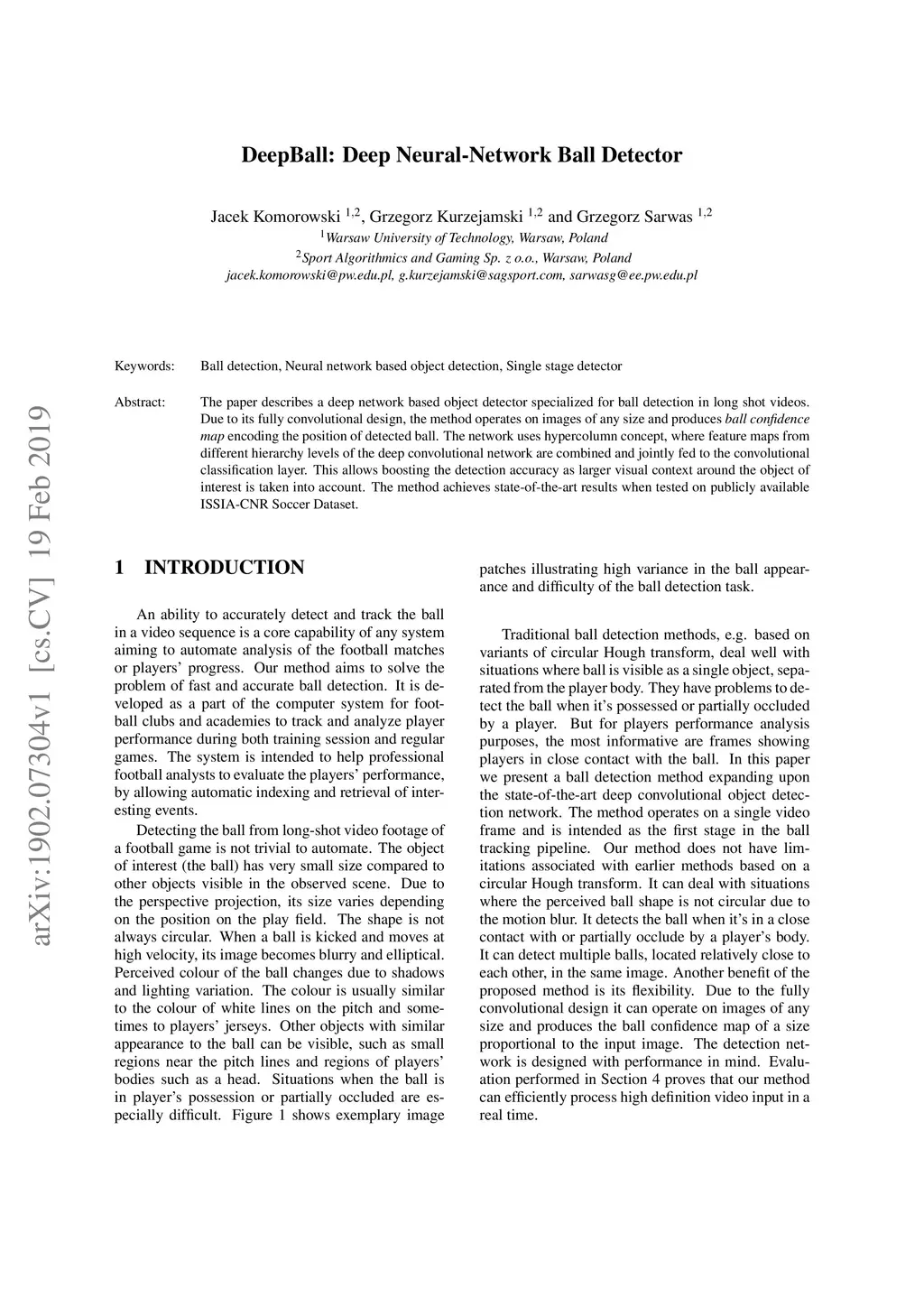The paper describes a deep network based object detector specialized for ball detection in long shot videos. Due to its fully convolutional design, the method operates on images of any size and produces \emph{ball confidence map} encoding the position of detected ball. The network uses hypercolumn concept, where feature maps from different hierarchy levels of the deep convolutional network are combined and jointly fed to the convolutional classification layer. This allows boosting the detection accuracy as larger visual context around the object of interest is taken into account. The method achieves state-of-the-art results when tested on publicly available ISSIA-CNR Soccer Dataset.