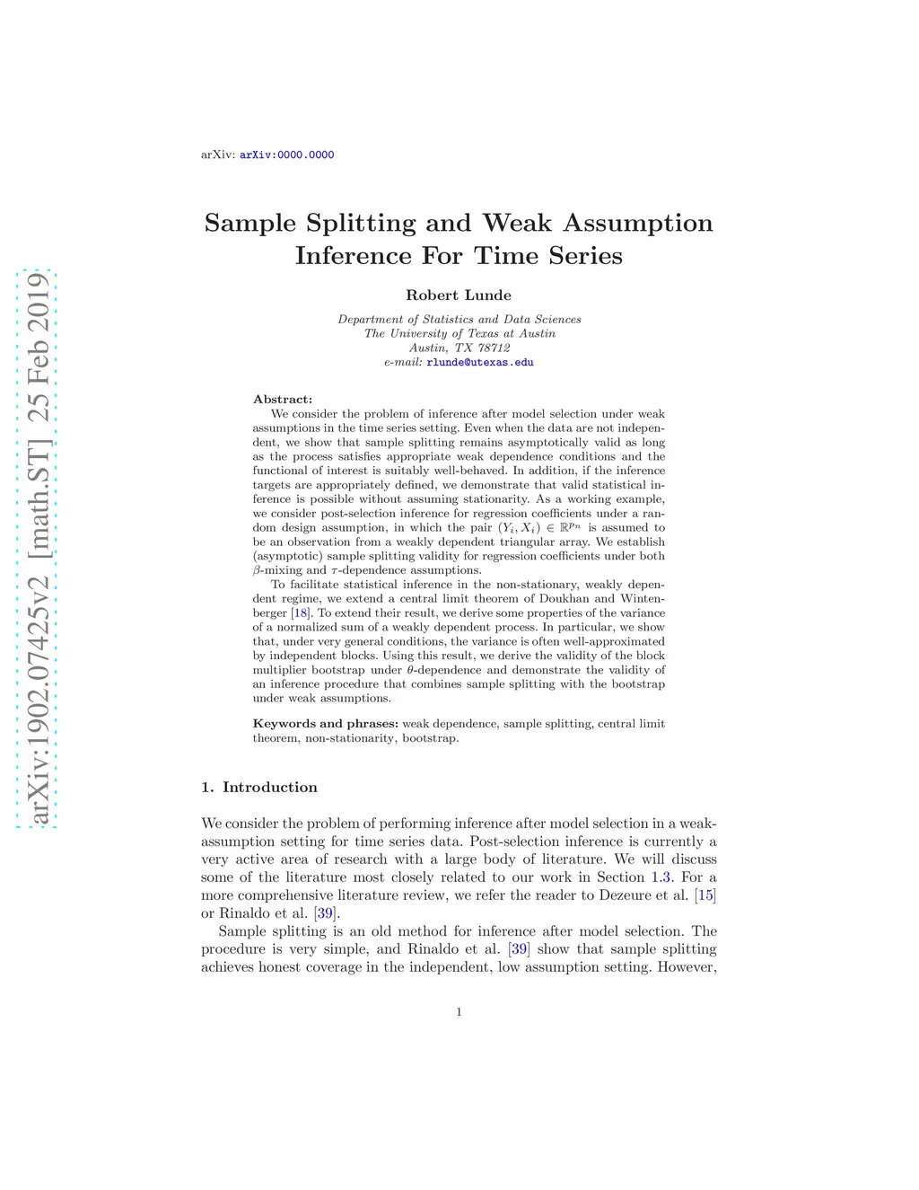 We consider the problem of inference after model selection under weak assumptions in the time series setting. Even when the data are not independent, we show that sample splitting remains asymptotically valid as long as the process satisfies appropriate weak dependence conditions and the functional of interest is suitably well-behaved. In addition, if the inference targets are appropriately defined, we demonstrate that valid statistical inference is possible without assuming stationarity. As a working example, we consider post-selection inference for regression coefficients under a random design assumption, in which the pair is assumed to be an observation from a weakly dependent triangular array. We establish (asymptotic) sample splitting validity for regression coefficients under both -mixing and -dependence assumptions. To facilitate statistical inference in the non-stationary, weakly dependent regime, we extend a central limit theorem of Doukhan and Wintenberger (2007). To extend their result, we derive some properties of the variance of a normalized sum of a weakly dependent process. In particular, we show that, under very general conditions, the variance is often well-approximated by independent blocks. Using this result, we derive the validity of the block multiplier bootstrap under -dependence and demonstrate the validity of an inference procedure that combines sample splitting with the bootstrap under weak assumptions.