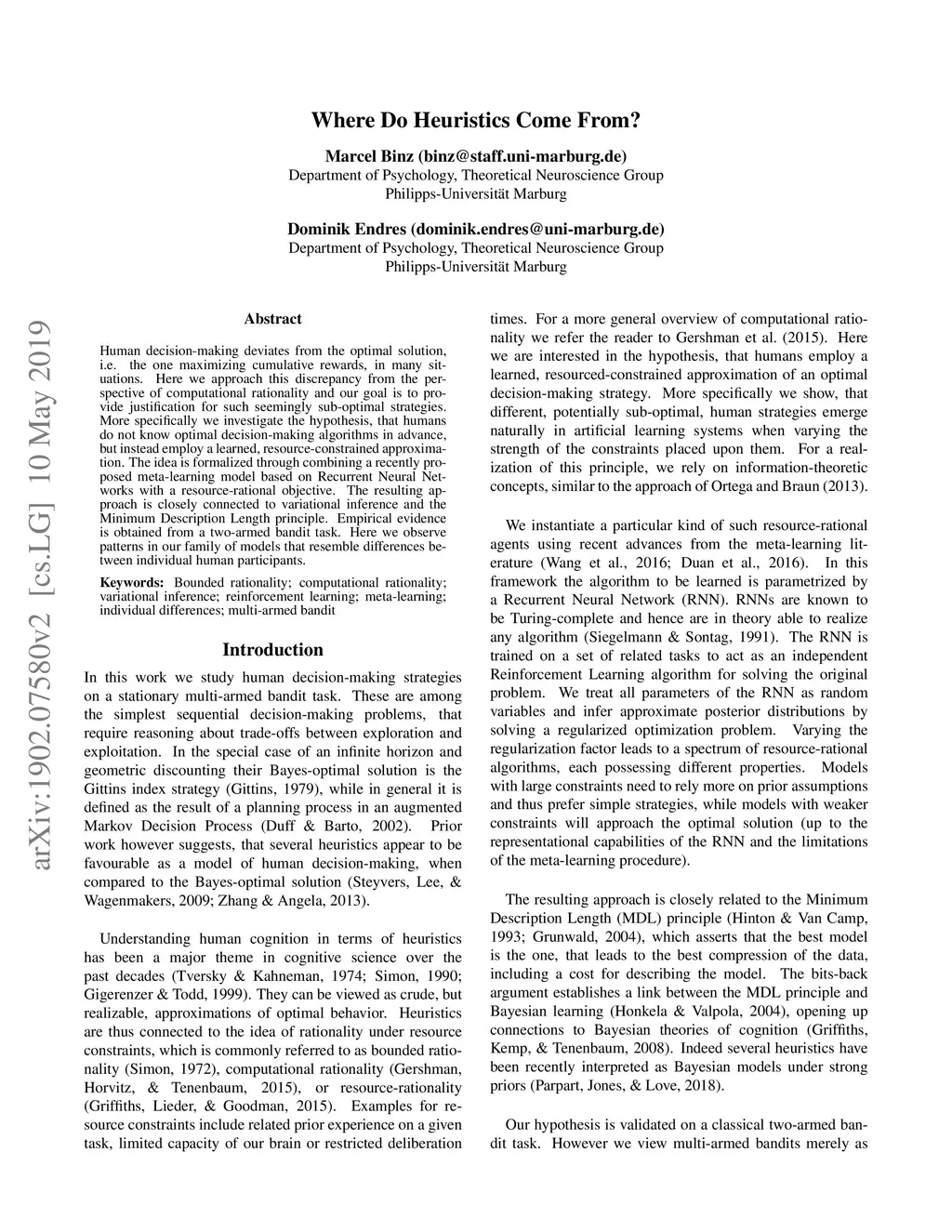 Human decision-making deviates from the optimal solution, that maximizes cumulative rewards, in many situations. Here we approach this discrepancy from the perspective of bounded rationality and our goal is to provide a justification for such seemingly sub-optimal strategies. More specifically we investigate the hypothesis, that humans do not know optimal decision-making algorithms in advance, but instead employ a learned, resource-bounded approximation. The idea is formalized through combining a recently proposed meta-learning model based on Recurrent Neural Networks with a resource-bounded objective. The resulting approach is closely connected to variational inference and the Minimum Description Length principle. Empirical evidence is obtained from a two-armed bandit task. Here we observe patterns in our family of models that resemble differences between individual human participants.