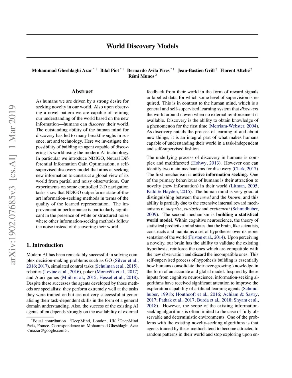 As humans we are driven by a strong desire for seeking novelty in our world. Also upon observing a novel pattern we are capable of refining our understanding of the world based on the new information---humans can discover their world. The outstanding ability of the human mind for discovery has led to many breakthroughs in science, art and technology. Here we investigate the possibility of building an agent capable of discovering its world using the modern AI technology. In particular we introduce NDIGO, Neural Differential Information Gain Optimisation, a self-supervised discovery model that aims at seeking new information to construct a global view of its world from partial and noisy observations. Our experiments on some controlled 2-D navigation tasks show that NDIGO outperforms state-of-the-art information-seeking methods in terms of the quality of the learned representation. The improvement in performance is particularly significant in the presence of white or structured noise where other information-seeking methods follow the noise instead of discovering their world.