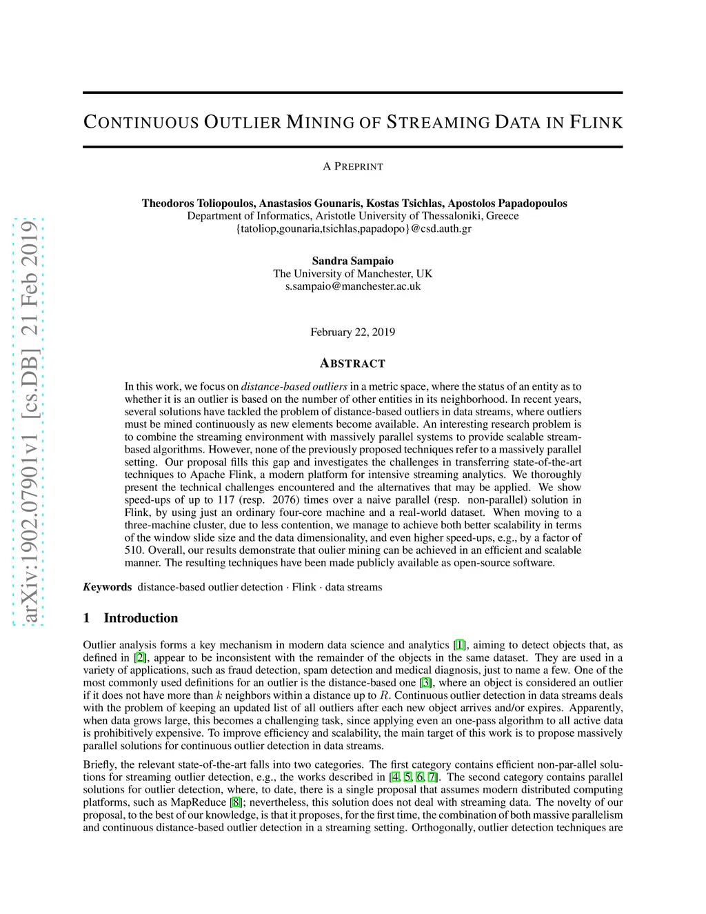 In this work, we focus on distance-based outliers in a metric space, where the status of an entity as to whether it is an outlier is based on the number of other entities in its neighborhood. In recent years, several solutions have tackled the problem of distance-based outliers in data streams, where outliers must be mined continuously as new elements become available. An interesting research problem is to combine the streaming environment with massively parallel systems to provide scalable streambased algorithms. However, none of the previously proposed techniques refer to a massively parallel setting. Our proposal fills this gap and investigates the challenges in transferring state-of-the-art techniques to Apache Flink, a modern platform for intensive streaming analytics. We thoroughly present the technical challenges encountered and the alternatives that may be applied. We show speed-ups of up to 117 (resp. 2076) times over a naive parallel (resp. non-parallel) solution in Flink, by using just an ordinary four-core machine and a real-world dataset. When moving to a three-machine cluster, due to less contention, we manage to achieve both better scalability in terms of the window slide size and the data dimensionality, and even higher speed-ups, e.g., by a factor of 510. Overall, our results demonstrate that oulier mining can be achieved in an efficient and scalable manner. The resulting techniques have been made publicly available as open-source software.
