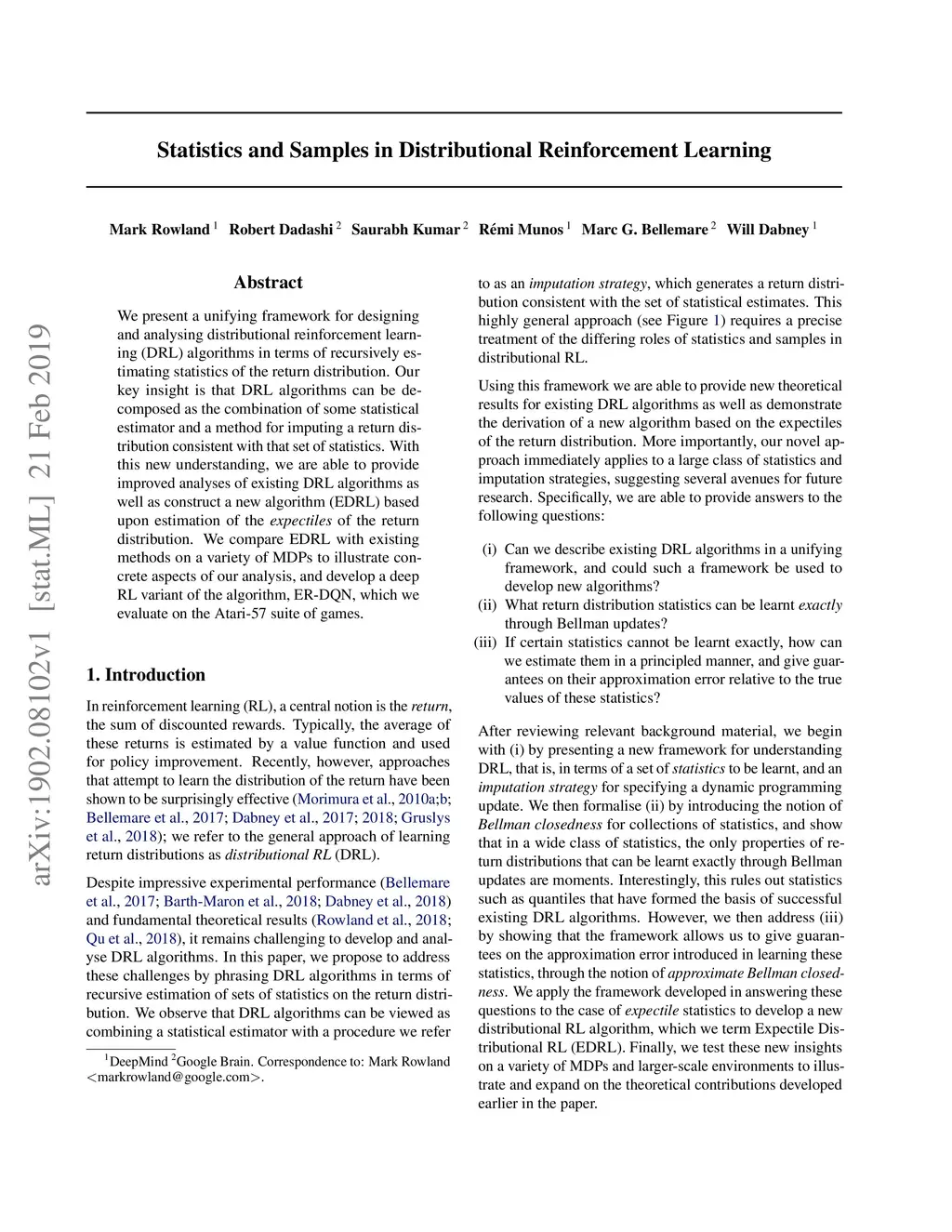 We present a unifying framework for designing and analysing distributional reinforcement learning (DRL) algorithms in terms of recursively estimating statistics of the return distribution. Our key insight is that DRL algorithms can be decomposed as the combination of some statistical estimator and a method for imputing a return distribution consistent with that set of statistics. With this new understanding, we are able to provide improved analyses of existing DRL algorithms as well as construct a new algorithm (EDRL) based upon estimation of the expectiles of the return distribution. We compare EDRL with existing methods on a variety of MDPs to illustrate concrete aspects of our analysis, and develop a deep RL variant of the algorithm, ER-DQN, which we evaluate on the Atari-57 suite of games.