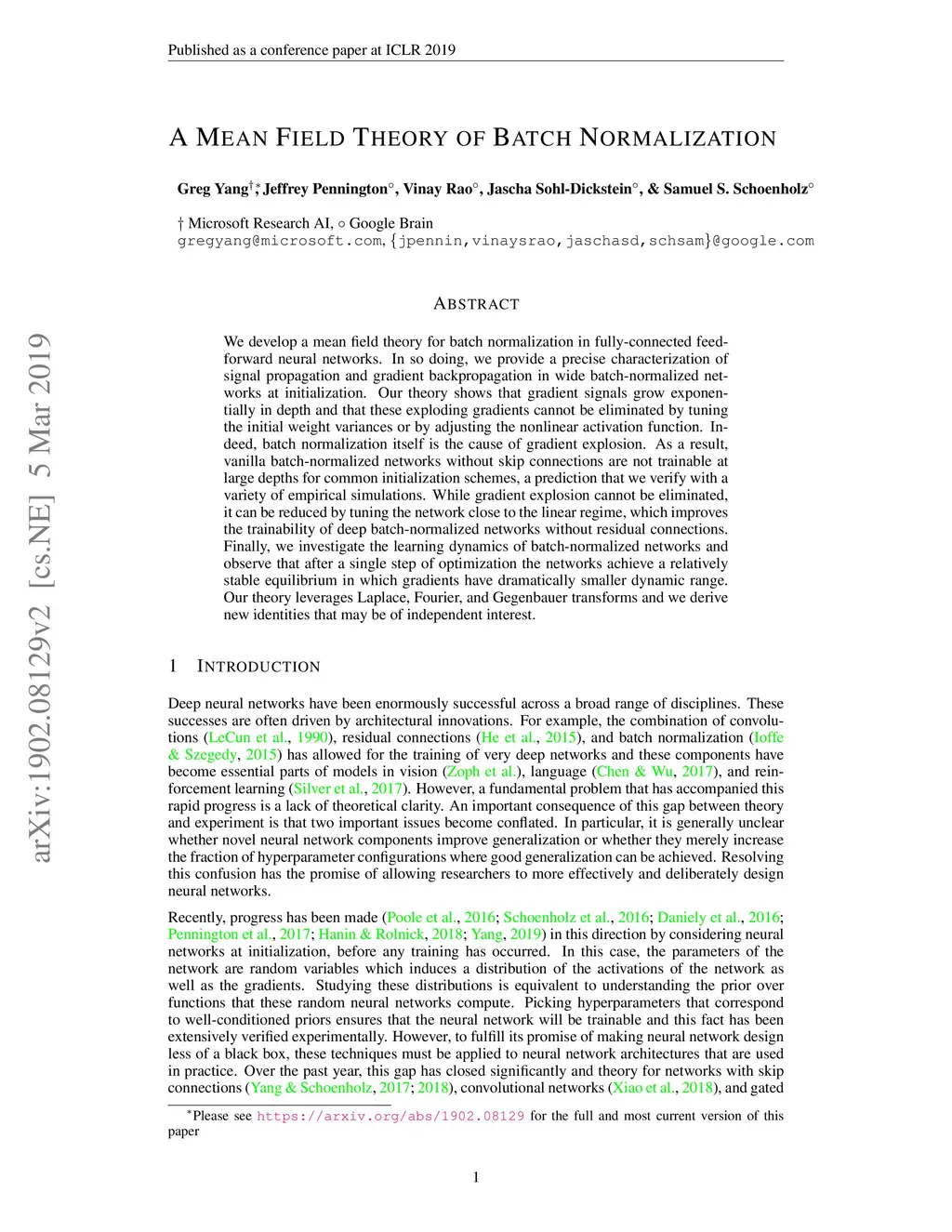 We develop a mean field theory for batch normalization in fully-connected feedforward neural networks. In so doing, we provide a precise characterization of signal propagation and gradient backpropagation in wide batch-normalized networks at initialization. Our theory shows that gradient signals grow exponentially in depth and that these exploding gradients cannot be eliminated by tuning the initial weight variances or by adjusting the nonlinear activation function. Indeed, batch normalization itself is the cause of gradient explosion. As a result, vanilla batch-normalized networks without skip connections are not trainable at large depths for common initialization schemes, a prediction that we verify with a variety of empirical simulations. While gradient explosion cannot be eliminated, it can be reduced by tuning the network close to the linear regime, which improves the trainability of deep batch-normalized networks without residual connections. Finally, we investigate the learning dynamics of batch-normalized networks and observe that after a single step of optimization the networks achieve a relatively stable equilibrium in which gradients have dramatically smaller dynamic range. Our theory leverages Laplace, Fourier, and Gegenbauer transforms and we derive new identities that may be of independent interest.