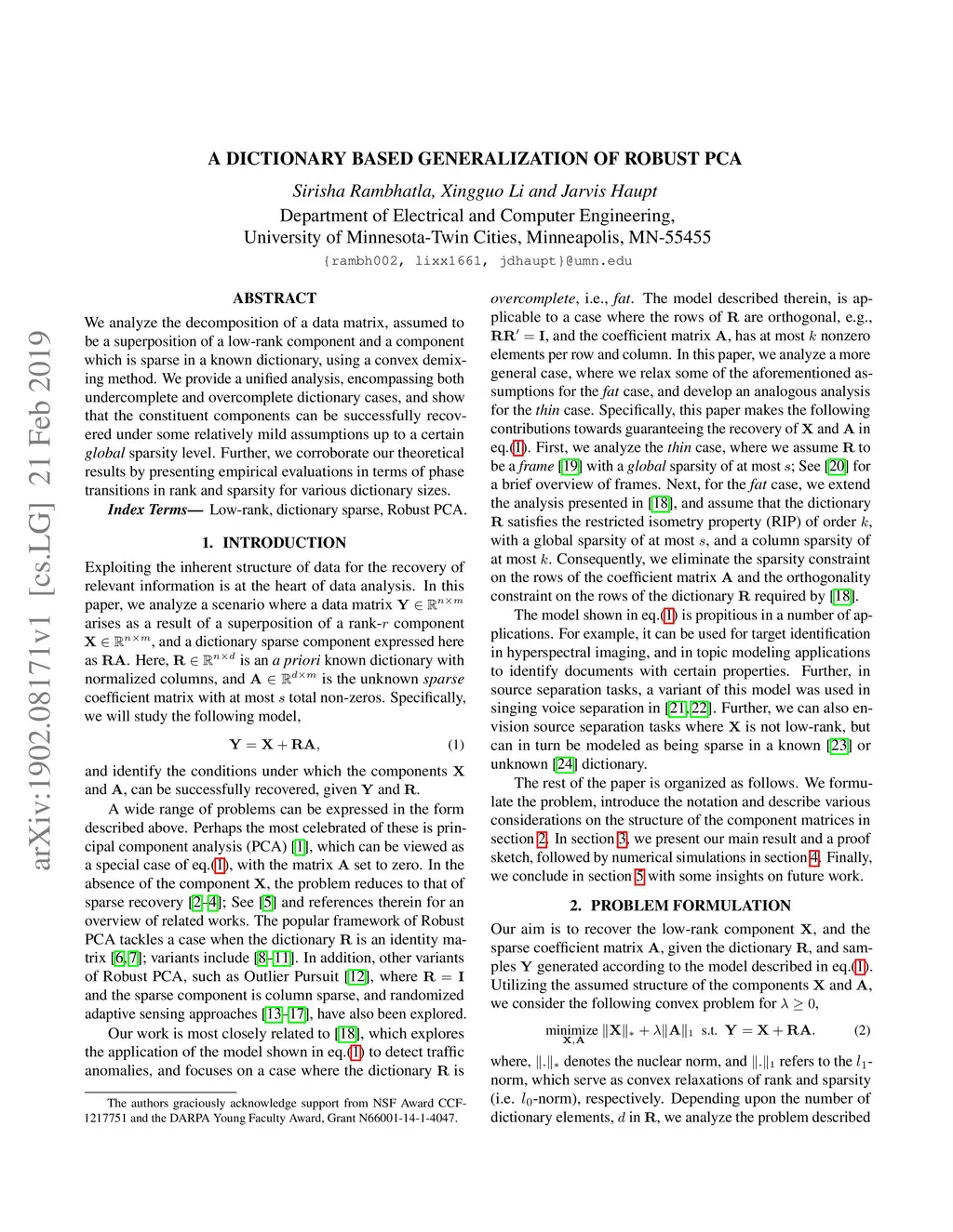 We analyze the decomposition of a data matrix, assumed to be a superposition of a low-rank component and a component which is sparse in a known dictionary, using a convex demixing method. We provide a unified analysis, encompassing both undercomplete and overcomplete dictionary cases, and show that the constituent components can be successfully recovered under some relatively mild assumptions up to a certain sparsity level. Further, we corroborate our theoretical results by presenting empirical evaluations in terms of phase transitions in rank and sparsity for various dictionary sizes.