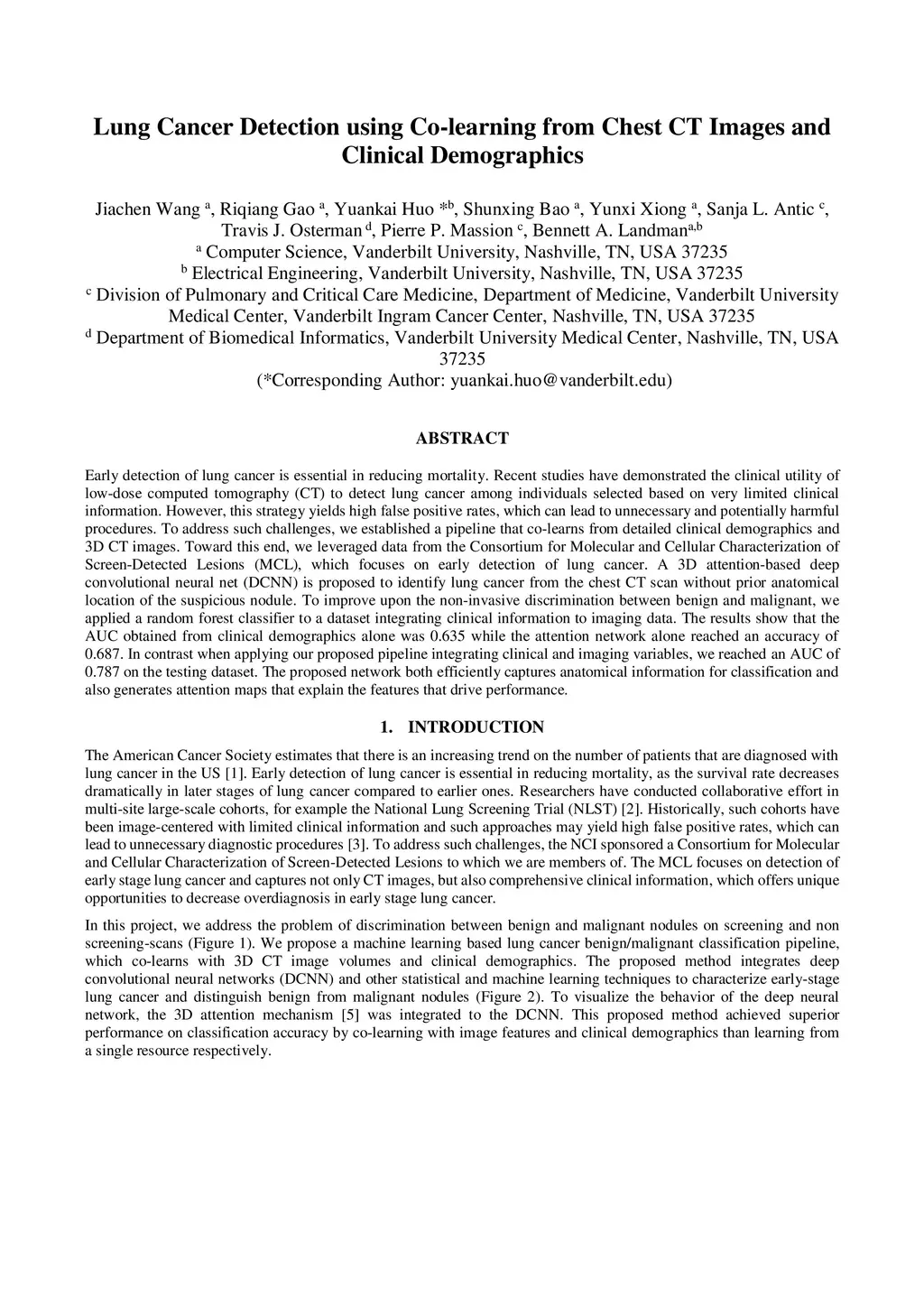 Early detection of lung cancer is essential in reducing mortality. Recent studies have demonstrated the clinical utility of low-dose computed tomography (CT) to detect lung cancer among individuals selected based on very limited clinical information. However, this strategy yields high false positive rates, which can lead to unnecessary and potentially harmful procedures. To address such challenges, we established a pipeline that co-learns from detailed clinical demographics and 3D CT images. Toward this end, we leveraged data from the Consortium for Molecular and Cellular Characterization of Screen-Detected Lesions (MCL), which focuses on early detection of lung cancer. A 3D attention-based deep convolutional neural net (DCNN) is proposed to identify lung cancer from the chest CT scan without prior anatomical location of the suspicious nodule. To improve upon the non-invasive discrimination between benign and malignant, we applied a random forest classifier to a dataset integrating clinical information to imaging data. The results show that the AUC obtained from clinical demographics alone was 0.635 while the attention network alone reached an accuracy of 0.687. In contrast when applying our proposed pipeline integrating clinical and imaging variables, we reached an AUC of 0.787 on the testing dataset. The proposed network both efficiently captures anatomical information for classification and also generates attention maps that explain the features that drive performance.