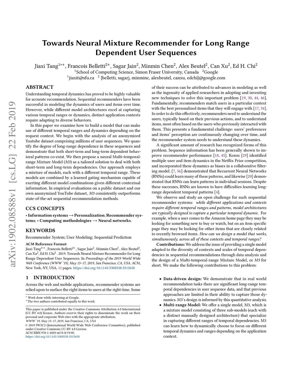Understanding temporal dynamics has proved to be highly valuable for accurate recommendation. Sequential recommenders have been successful in modeling the dynamics of users and items over time. However, while different model architectures excel at capturing various temporal ranges or dynamics, distinct application contexts require adapting to diverse behaviors. In this paper we examine how to build a model that can make use of different temporal ranges and dynamics depending on the request context. We begin with the analysis of an anonymized Youtube dataset comprising millions of user sequences. We quantify the degree of long-range dependence in these sequences and demonstrate that both short-term and long-term dependent behavioral patterns co-exist. We then propose a neural Multi-temporal-range Mixture Model (M3) as a tailored solution to deal with both short-term and long-term dependencies. Our approach employs a mixture of models, each with a different temporal range. These models are combined by a learned gating mechanism capable of exerting different model combinations given different contextual information. In empirical evaluations on a public dataset and our own anonymized YouTube dataset, M3 consistently outperforms state-of-the-art sequential recommendation methods.