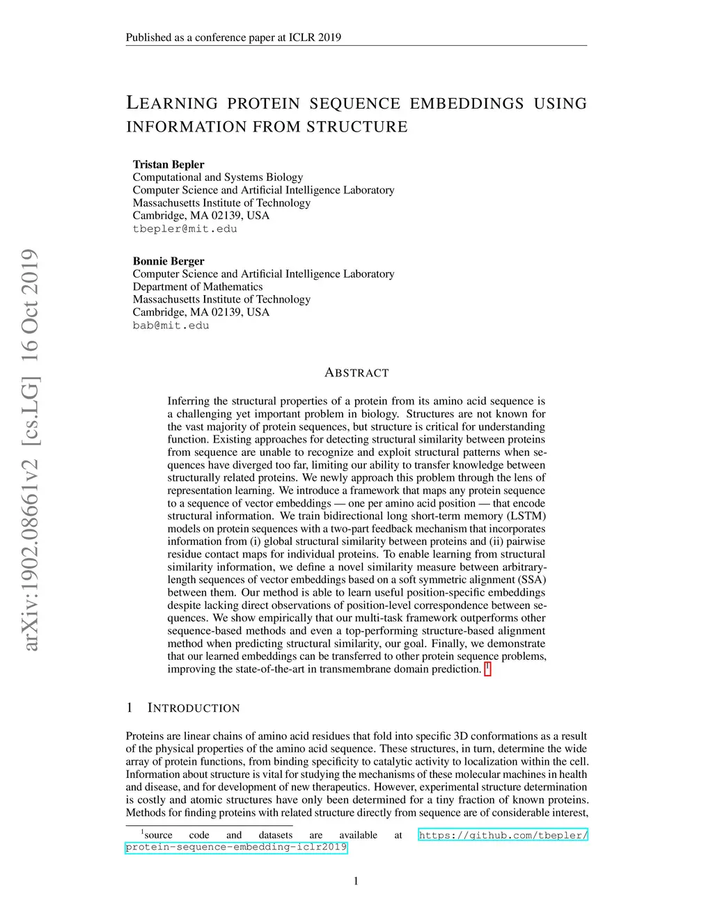Inferring the structural properties of a protein from its amino acid sequence is a challenging yet important problem in biology. Structures are not known for the vast majority of protein sequences, but structure is critical for understanding function. Existing approaches for detecting structural similarity between proteins from sequence are unable to recognize and exploit structural patterns when sequences have diverged too far, limiting our ability to transfer knowledge between structurally related proteins. We newly approach this problem through the lens of representation learning. We introduce a framework that maps any protein sequence to a sequence of vector embeddings --- one per amino acid position --- that encode structural information. We train bidirectional long short-term memory (LSTM) models on protein sequences with a two-part feedback mechanism that incorporates information from (i) global structural similarity between proteins and (ii) pairwise residue contact maps for individual proteins. To enable learning from structural similarity information, we define a novel similarity measure between arbitrary-length sequences of vector embeddings based on a soft symmetric alignment (SSA) between them. Our method is able to learn useful position-specific embeddings despite lacking direct observations of position-level correspondence between sequences. We show empirically that our multi-task framework outperforms other sequence-based methods and even a top-performing structure-based alignment method when predicting structural similarity, our goal. Finally, we demonstrate that our learned embeddings can be transferred to other protein sequence problems, improving the state-of-the-art in transmembrane domain prediction.