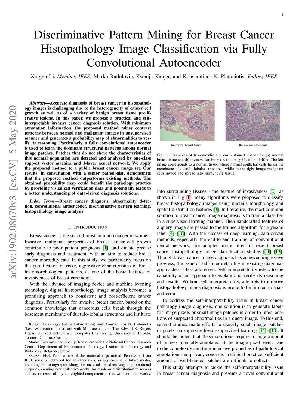 Accurate diagnosis of breast cancer in histopathology images is challenging due to the heterogeneity of cancer cell growth as well as of a variety of benign breast tissue proliferative lesions. In this paper, we propose a practical and self-interpretable invasive cancer diagnosis solution. With minimum annotation information, the proposed method mines contrast patterns between normal and malignant images in unsupervised manner and generates a probability map of abnormalities to verify its reasoning. Particularly, a fully convolutional autoencoder is used to learn the dominant structural patterns among normal image patches. Patches that do not share the characteristics of this normal population are detected and analyzed by one-class support vector machine and 1-layer neural network. We apply the proposed method to a public breast cancer image set. Our results, in consultation with a senior pathologist, demonstrate that the proposed method outperforms existing methods. The obtained probability map could benefit the pathology practice by providing visualized verification data and potentially leads to a better understanding of data-driven diagnosis solutions.