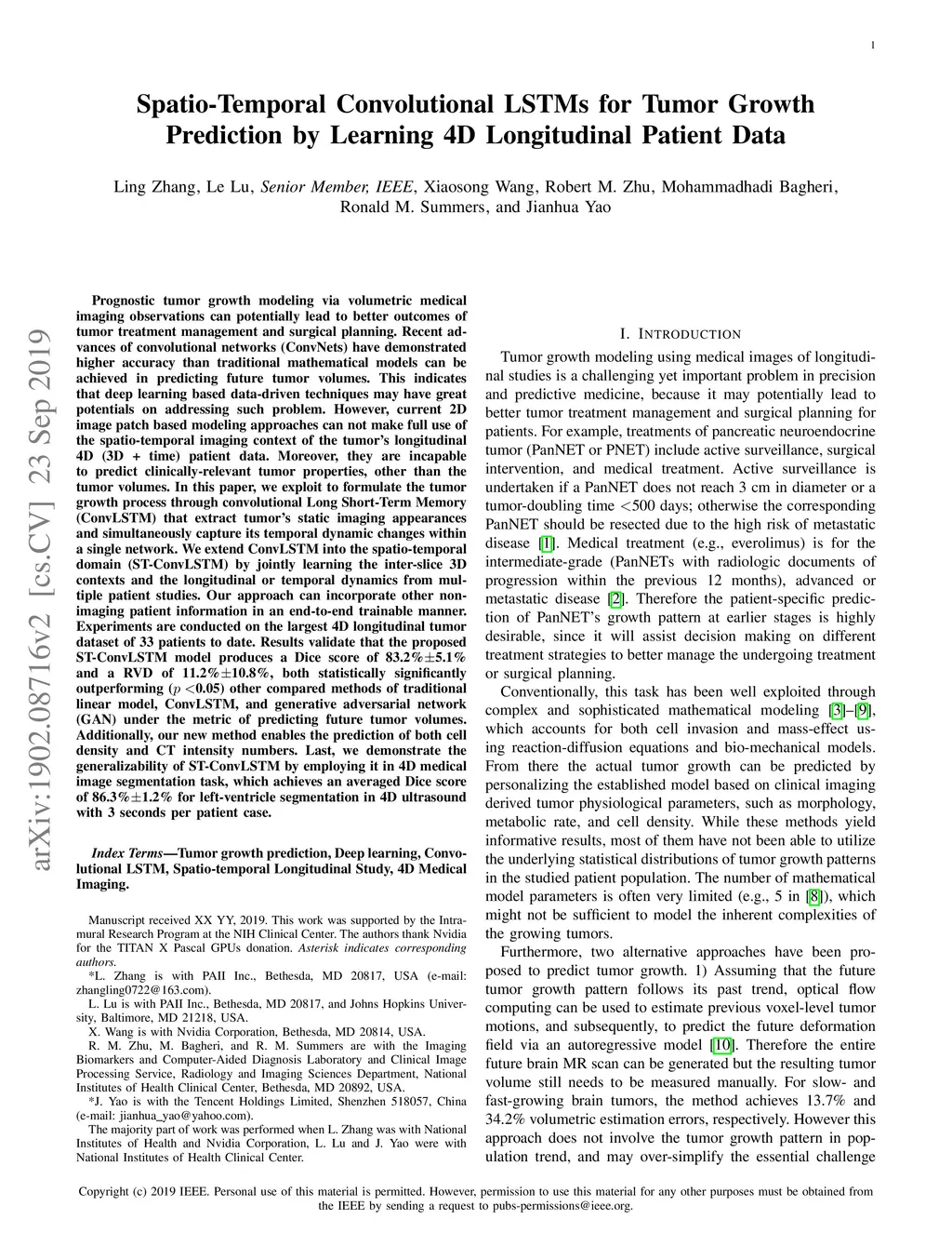 Prognostic tumor growth modeling via volumetric medical imaging observations can potentially lead to better outcomes of tumor treatment and surgical planning. Recent advances of convolutional networks have demonstrated higher accuracy than traditional mathematical models in predicting future tumor volumes. This indicates that deep learning-based techniques may have great potentials on addressing such problem. However, current 2D patch-based modeling approaches cannot make full use of the spatio-temporal imaging context of the tumor's longitudinal 4D (3D + time) data. Moreover, they are incapable to predict clinically-relevant tumor properties, other than volumes. In this paper, we exploit to formulate the tumor growth process through convolutional Long Short-Term Memory (ConvLSTM) that extract tumor's static imaging appearances and capture its temporal dynamic changes within a single network. We extend ConvLSTM into the spatio-temporal domain (ST-ConvLSTM) by jointly learning the inter-slice 3D contexts and the longitudinal or temporal dynamics from multiple patient studies. Our approach can incorporate other non-imaging patient information in an end-to-end trainable manner. Experiments are conducted on the largest 4D longitudinal tumor dataset of 33 patients to date. Results validate that the ST-ConvLSTM produces a Dice score of 83.2%+-5.1% and a RVD of 11.2%+-10.8%, both significantly outperforming (p<0.05) other compared methods of linear model, ConvLSTM, and generative adversarial network (GAN) under the metric of predicting future tumor volumes. Additionally, our new method enables the prediction of both cell density and CT intensity numbers. Last, we demonstrate the generalizability of ST-ConvLSTM by employing it in 4D medical image segmentation task, which achieves an averaged Dice score of 86.3+-1.2% for left-ventricle segmentation in 4D ultrasound with 3 seconds per patient.