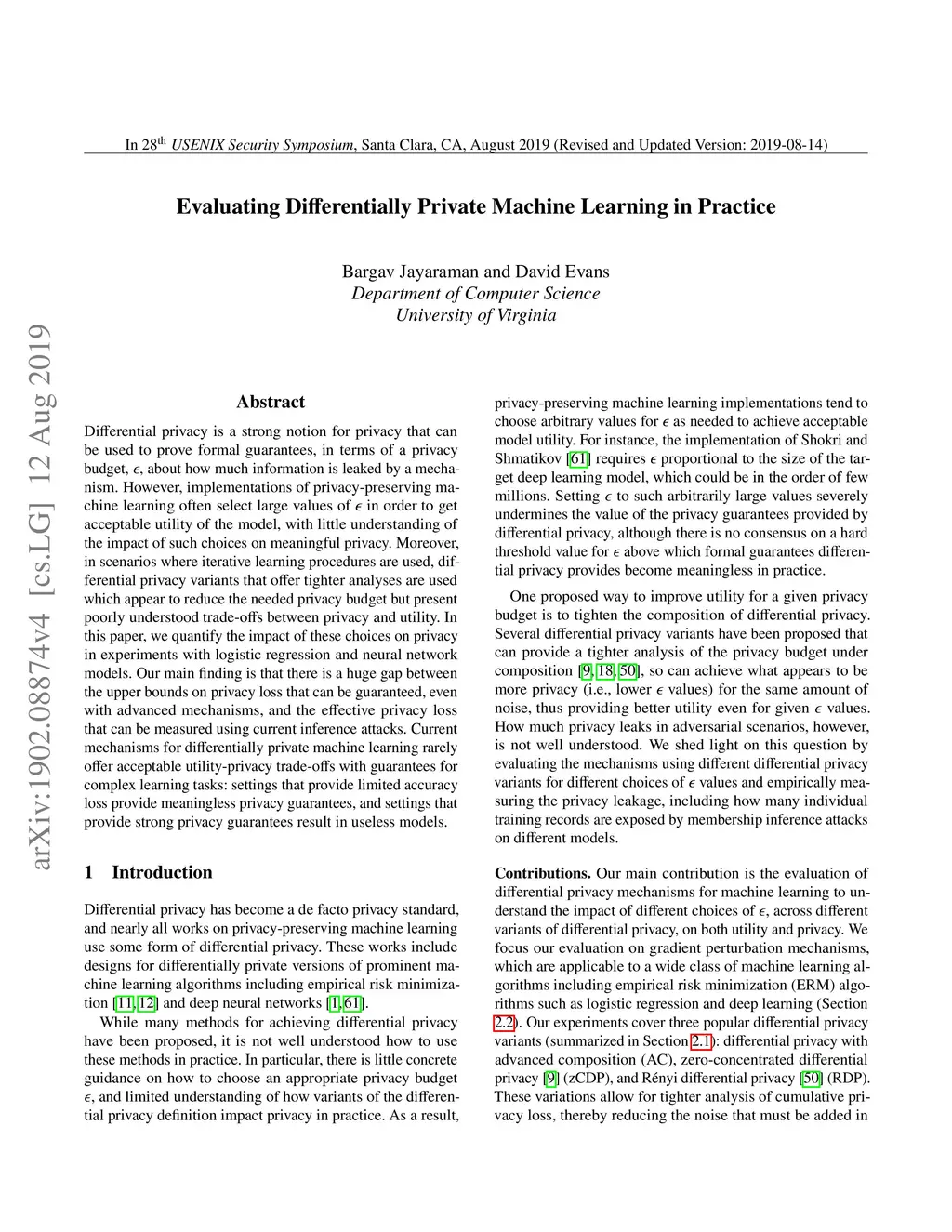 Differential privacy is a strong notion for privacy that can be used to prove formal guarantees, in terms of a privacy budget, , about how much information is leaked by a mechanism. However, implementations of privacy-preserving machine learning often select large values of in order to get acceptable utility of the model, with little understanding of the impact of such choices on meaningful privacy. Moreover, in scenarios where iterative learning procedures are used, differential privacy variants that offer tighter analyses are used which appear to reduce the needed privacy budget but present poorly understood trade-offs between privacy and utility. In this paper, we quantify the impact of these choices on privacy in experiments with logistic regression and neural network models. Our main finding is that there is a huge gap between the upper bounds on privacy loss that can be guaranteed, even with advanced mechanisms, and the effective privacy loss that can be measured using current inference attacks. Current mechanisms for differentially private machine learning rarely offer acceptable utility-privacy trade-offs with guarantees for complex learning tasks: settings that provide limited accuracy loss provide meaningless privacy guarantees, and settings that provide strong privacy guarantees result in useless models. Code for the experiments can be found here: https://github.com/bargavj/EvaluatingDPML