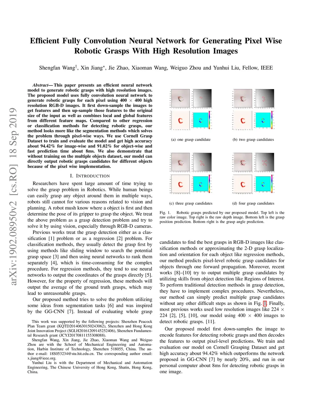 This paper presents an efficient neural network model to generate robotic grasps with high resolution images. The proposed model uses fully convolution neural network to generate robotic grasps for each pixel using 400 400 high resolution RGB-D images. It first down-sample the images to get features and then up-sample those features to the original size of the input as well as combines local and global features from different feature maps. Compared to other regression or classification methods for detecting robotic grasps, our method looks more like the segmentation methods which solves the problem through pixel-wise ways. We use Cornell Grasp Dataset to train and evaluate the model and get high accuracy about 94.42% for image-wise and 91.02% for object-wise and fast prediction time about 8ms. We also demonstrate that without training on the multiple objects dataset, our model can directly output robotic grasps candidates for different objects because of the pixel wise implementation.