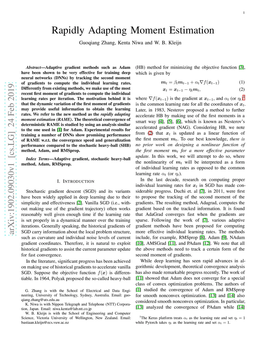 Adaptive gradient methods such as Adam have been shown to be very effective for training deep neural networks (DNNs) by tracking the second moment of gradients to compute the individual learning rates. Differently from existing methods, we make use of the most recent first moment of gradients to compute the individual learning rates per iteration. The motivation behind it is that the dynamic variation of the first moment of gradients may provide useful information to obtain the learning rates. We refer to the new method as the rapidly adapting moment estimation (RAME). The theoretical convergence of deterministic RAME is studied by using an analysis similar to the one used in [1] for Adam. Experimental results for training a number of DNNs show promising performance of RAME w.r.t. the convergence speed and generalization performance compared to the stochastic heavy-ball (SHB) method, Adam, and RMSprop.