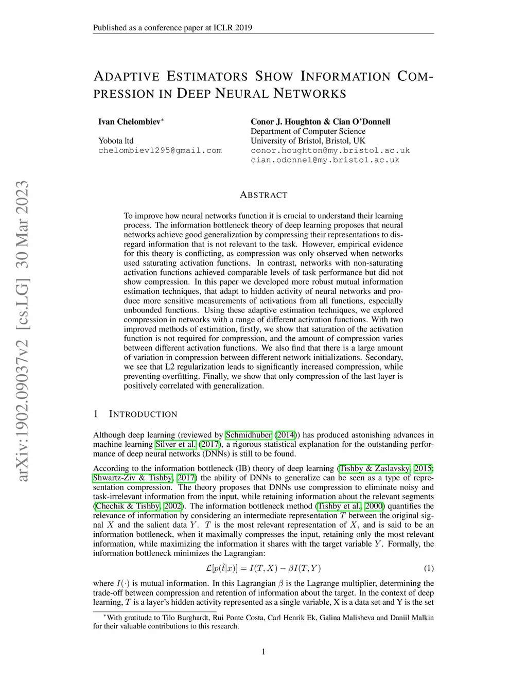 To improve how neural networks function it is crucial to understand their learning process. The information bottleneck theory of deep learning proposes that neural networks achieve good generalization by compressing their representations to disregard information that is not relevant to the task. However, empirical evidence for this theory is conflicting, as compression was only observed when networks used saturating activation functions. In contrast, networks with non-saturating activation functions achieved comparable levels of task performance but did not show compression. In this paper we developed more robust mutual information estimation techniques, that adapt to hidden activity of neural networks and produce more sensitive measurements of activations from all functions, especially unbounded functions. Using these adaptive estimation techniques, we explored compression in networks with a range of different activation functions. With two improved methods of estimation, firstly, we show that saturation of the activation function is not required for compression, and the amount of compression varies between different activation functions. We also find that there is a large amount of variation in compression between different network initializations. Secondary, we see that L2 regularization leads to significantly increased compression, while preventing overfitting. Finally, we show that only compression of the last layer is positively correlated with generalization.