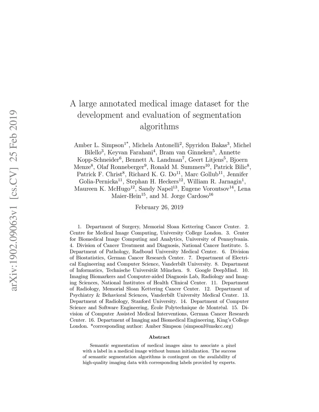 Semantic segmentation of medical images aims to associate a pixel with a label in a medical image without human initialization. The success of semantic segmentation algorithms is contingent on the availability of high-quality imaging data with corresponding labels provided by experts. We sought to create a large collection of annotated medical image datasets of various clinically relevant anatomies available under open source license to facilitate the development of semantic segmentation algorithms. Such a resource would allow: 1) objective assessment of general-purpose segmentation methods through comprehensive benchmarking and 2) open and free access to medical image data for any researcher interested in the problem domain. Through a multi-institutional effort, we generated a large, curated dataset representative of several highly variable segmentation tasks that was used in a crowd-sourced challenge - the Medical Segmentation Decathlon held during the 2018 Medical Image Computing and Computer Aided Interventions Conference in Granada, Spain. Here, we describe these ten labeled image datasets so that these data may be effectively reused by the research community.