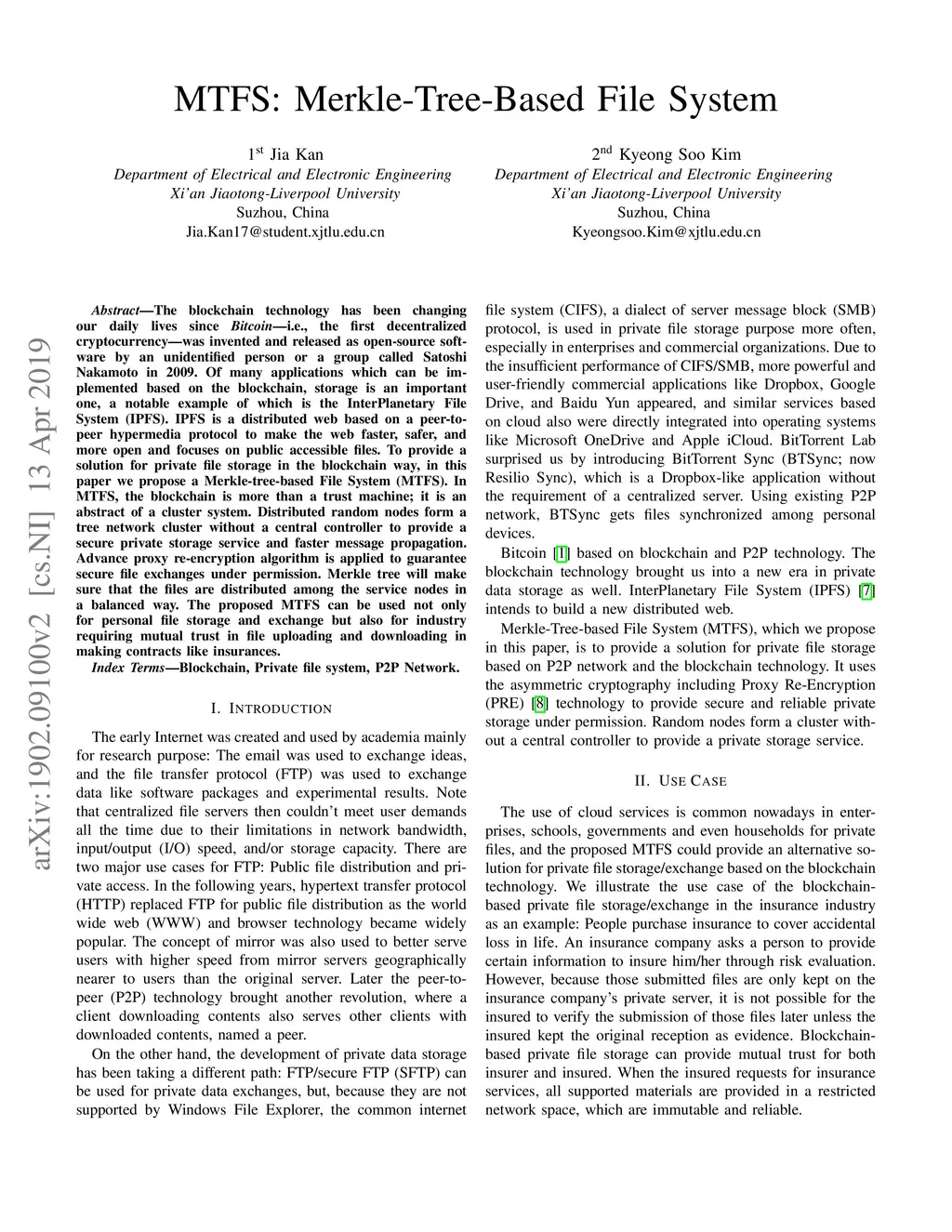 The blockchain technology has been changing our daily lives since Bitcoin - i.e., the first decentralized cryptocurrency - was invented and released as open-source software by an unidentified person or a group called Satoshi Nakamoto in 2009. Of many applications which can be implemented based on the blockchain, storage is an important one, a notable example of which is the InterPlanetary File System (IPFS). IPFS is a distributed web based on a peer-to-peer hypermedia protocol to make the web faster, safer, and more open and focuses on public accessible files. To provide a solution for private file storage in the blockchain way, in this paper we propose a Merkle-tree-based File System (MTFS). In MTFS, the blockchain is more than a trust machine; it is an abstract of a cluster system. Distributed random nodes form a tree network cluster without a central controller to provide a secure private storage service and faster message propagation. Advance proxy re-encryption algorithm is applied to guarantee secure file exchanges under permission. Merkle tree will make sure that the files are distributed among the service nodes in a balanced way. The proposed MTFS can be used not only for personal file storage and exchange but also for industry requiring mutual trust in file uploading and downloading in making contracts like insurances.