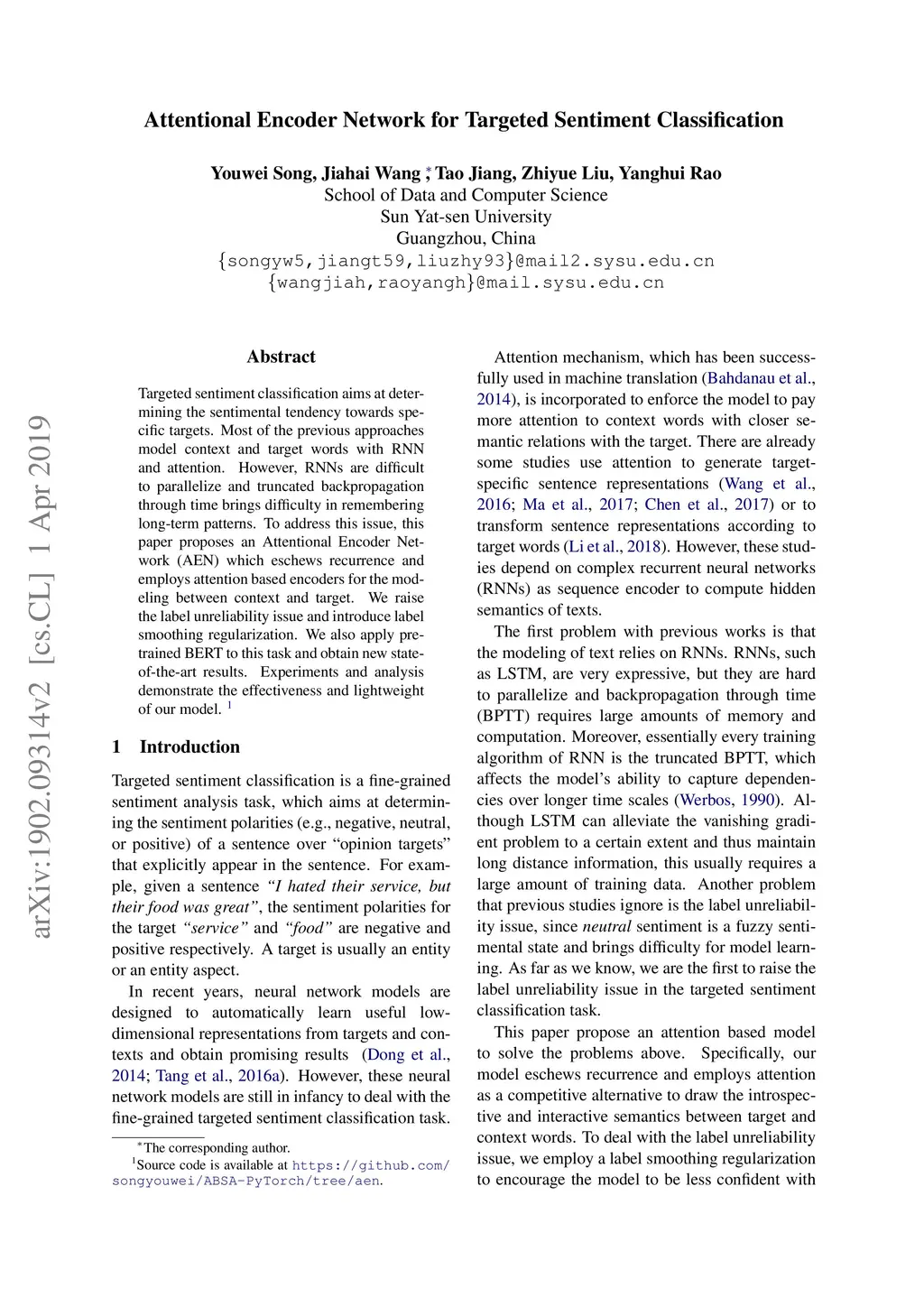 Targeted sentiment classification aims at determining the sentimental tendency towards specific targets. Most of the previous approaches model context and target words with RNN and attention. However, RNNs are difficult to parallelize and truncated backpropagation through time brings difficulty in remembering long-term patterns. To address this issue, this paper proposes an Attentional Encoder Network (AEN) which eschews recurrence and employs attention based encoders for the modeling between context and target. We raise the label unreliability issue and introduce label smoothing regularization. We also apply pre-trained BERT to this task and obtain new state-of-the-art results. Experiments and analysis demonstrate the effectiveness and lightweight of our model.
