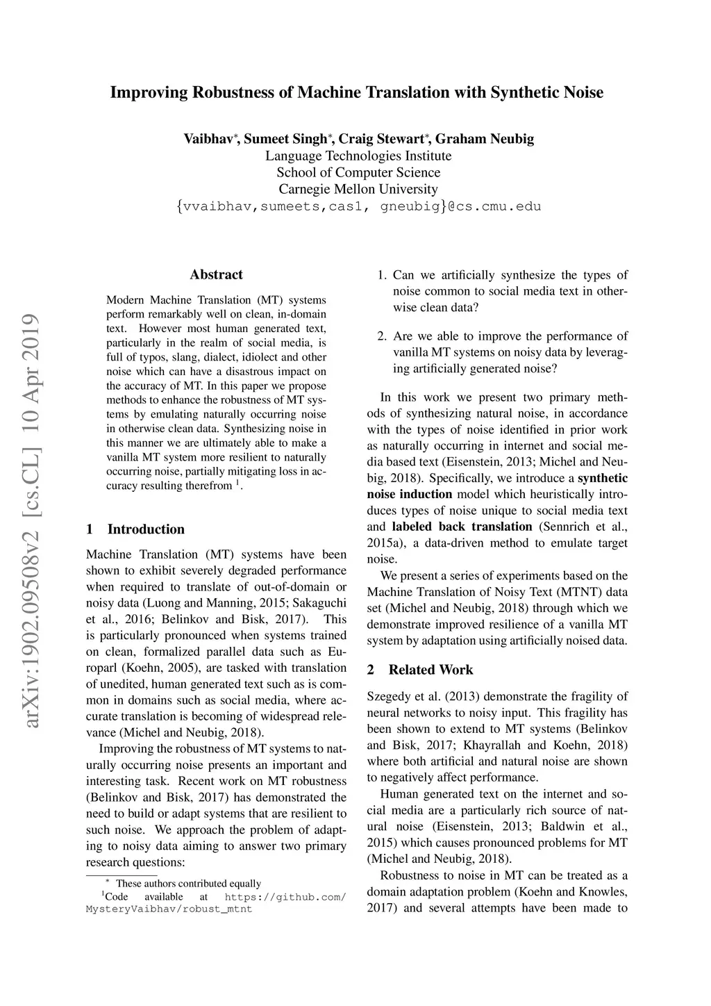 Improving Robustness of Machine Translation with Synthetic Noise